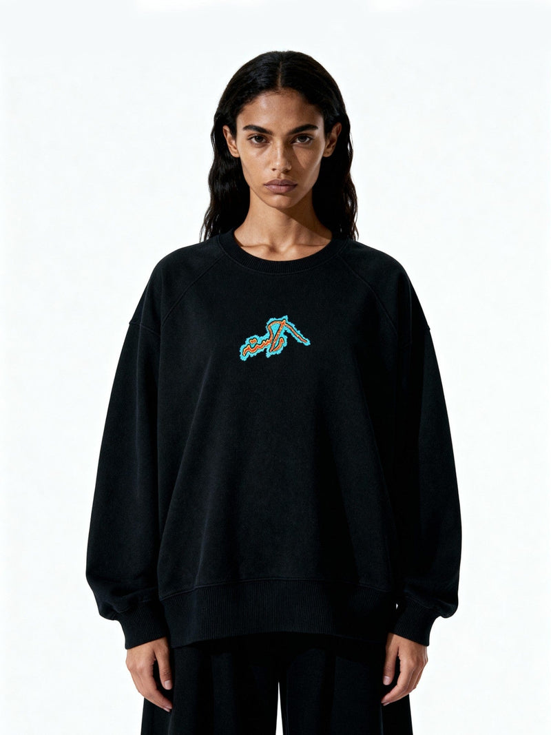This black sweatshirt carries the quiet strength of identity — unshaken, unpretentious, and deeply rooted. Crafted from heavyweight cotton fleece, it features minimal Urdu screen print on the front and a bold, screen-printed graphic on the back reading Rastah — Made in Pakistan.