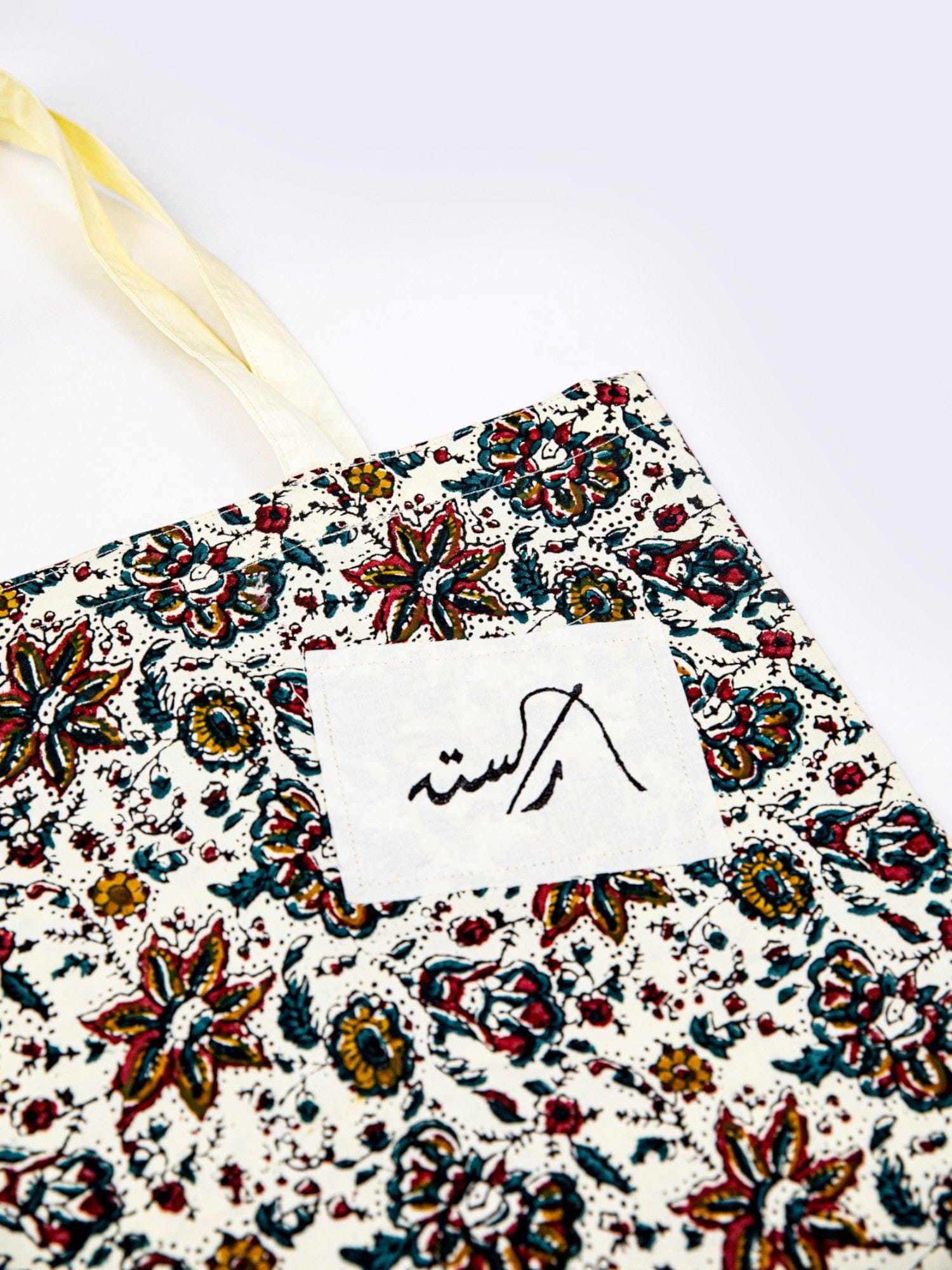 A hand-crafted tote made using traditional block-printing techniques, natural dyes, and durable canvas cotton. Each piece includes a hand-stitched Rastah logo and is finished in a standard mid-size silhouette.