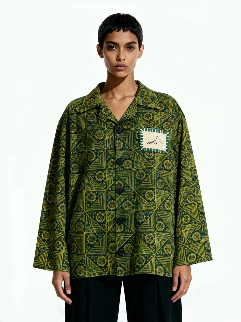 The Handmade Sindhi Ajrak Button-Down Shirt celebrates Pakistan’s rich craft legacy through contemporary tailoring. Cut from soft cotton and adorned with intricate hand block-printed Ajrak motifs, it features a stitched screen-printed logo patch that adds a modern accent. Each pattern is individually hand-pressed, creating subtle variations that make every piece unique. Designed with a relaxed fit, button front, and full sleeves, it’s a statement of culture refined through minimalist design.