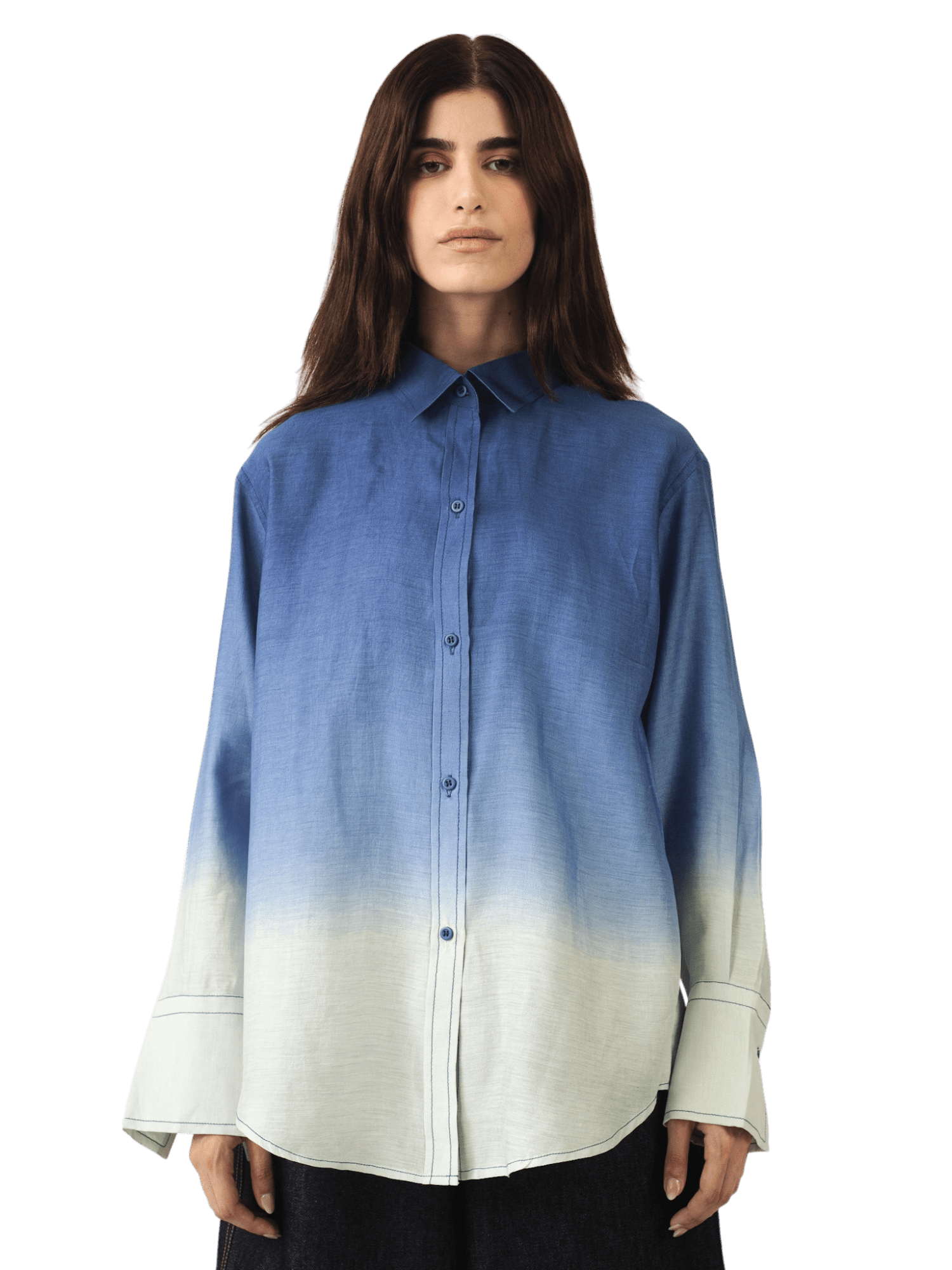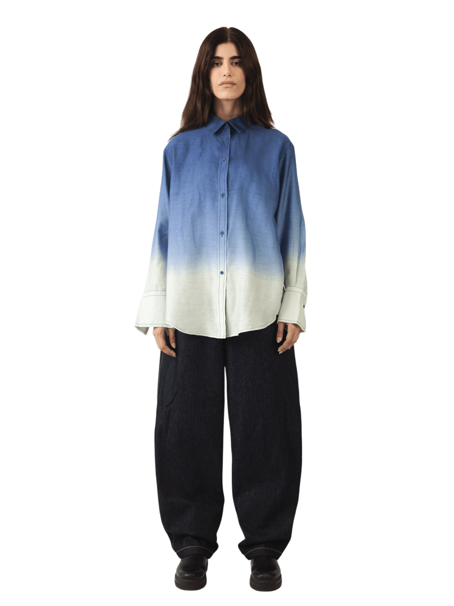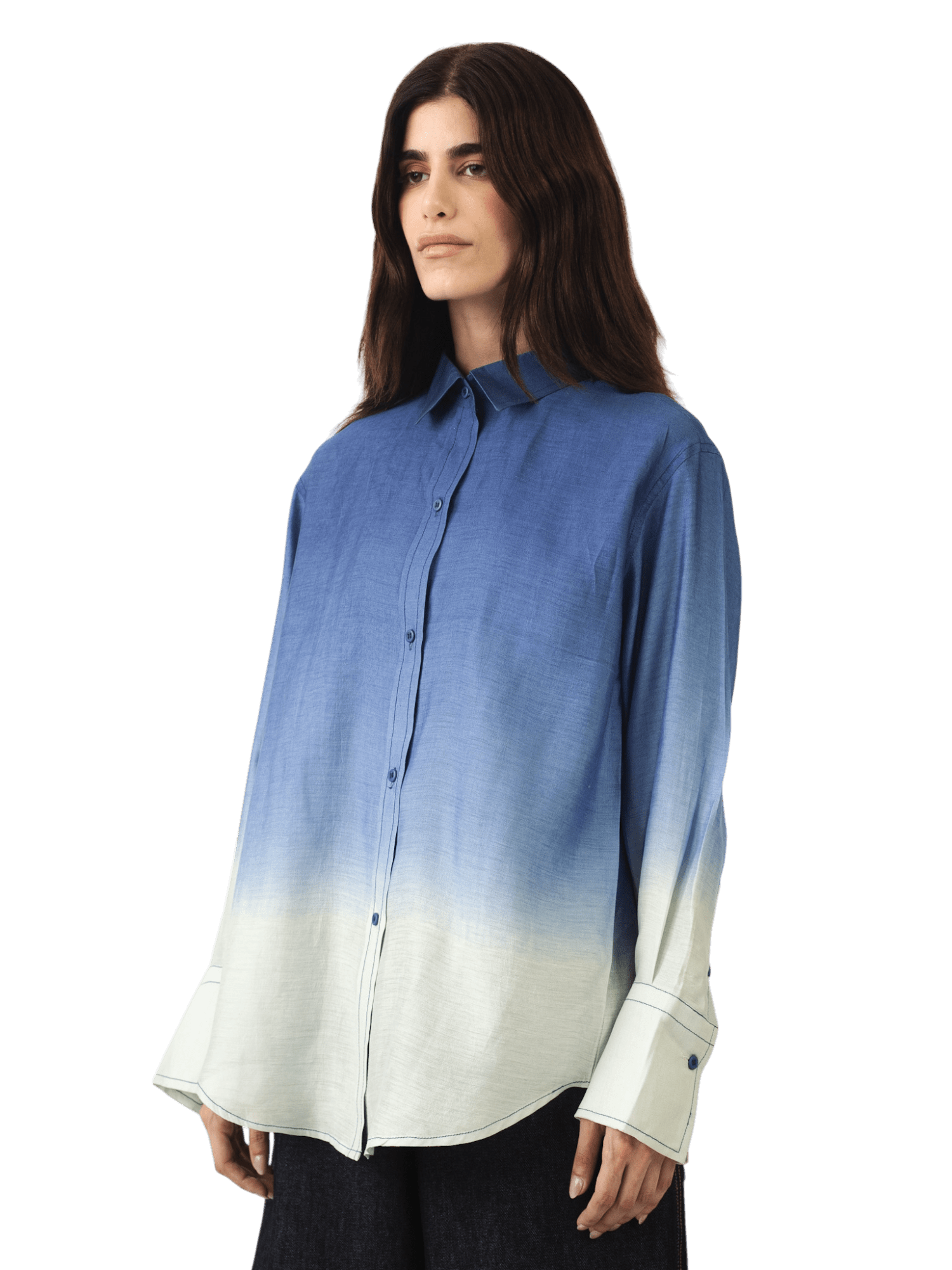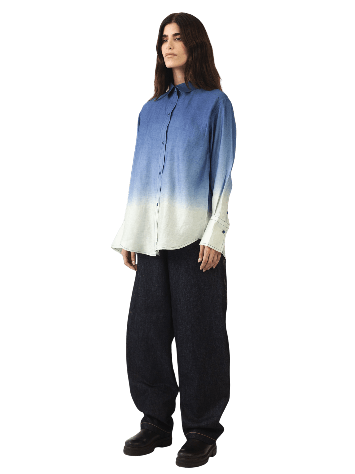 Crafted from luxurious silk and hand-dyed in a soft blue-to-ivory gradient, the Azure Bloom Silk Button-Down captures the essence of fluidity and calm. This relaxed, oversized silhouette flows effortlessly with every step, pairing traditional tie and dye artistry with a modern shape. A statement in subtlety—this shirt speaks volumes with its softness, drape, and gradient tone.