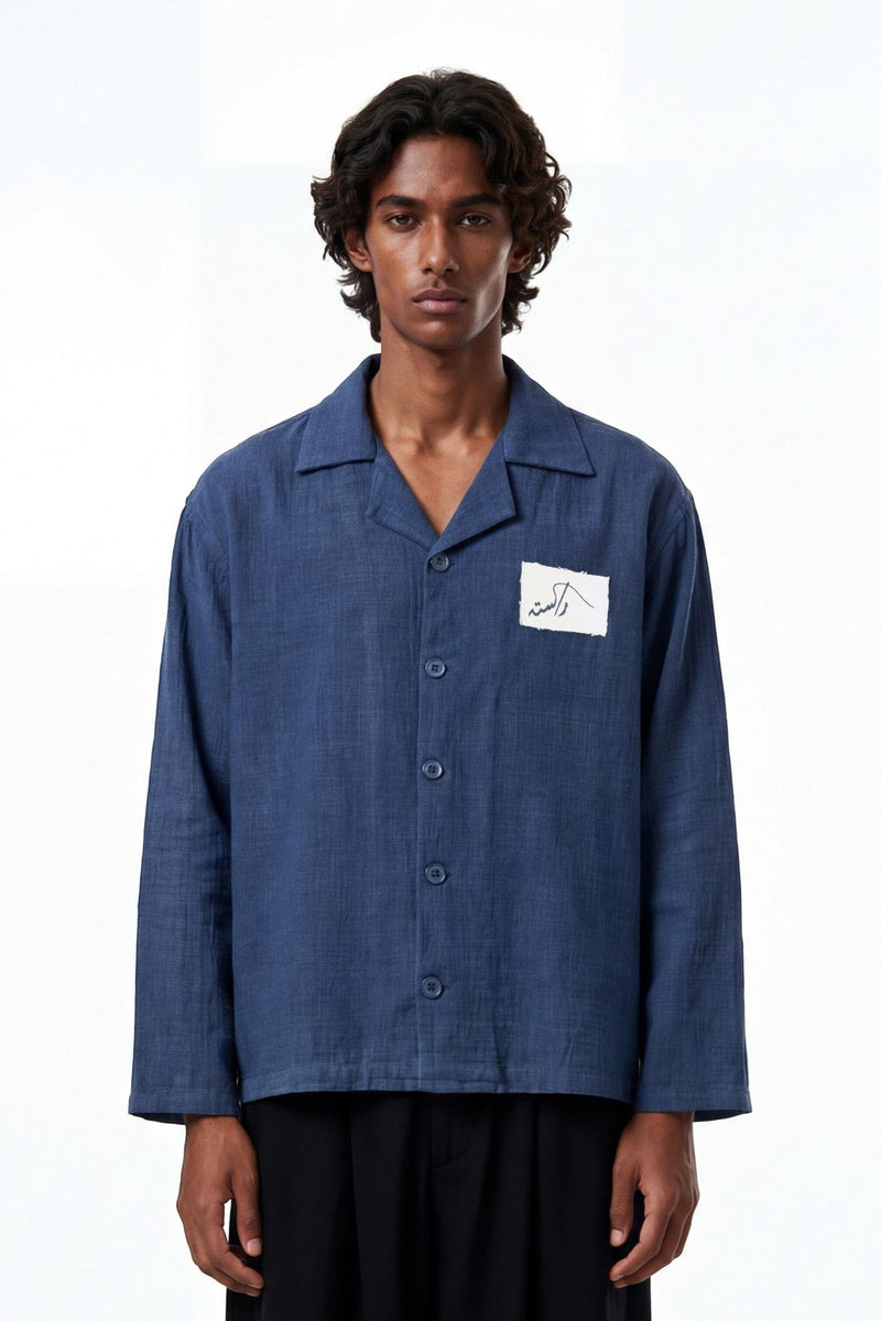 Crafted in textured khaddar, this button-down shirt carries the feeling of a journey stitched into fabric. The deep blue base acts as a canvas for layered patches at the back — a map fragment, illustrated postcards, Urdu typography, and symbolic motifs that feel collected over time rather than placed all at once.