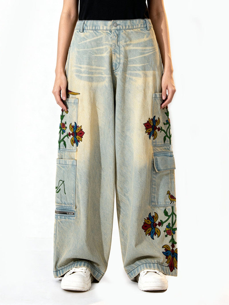 Made from washed and sprayed denim, each piece features hand block-printed floral motifs — a nod to rural craft reimagined for urban landscapes. Functional cargo pockets and a relaxed structure emphasize utility, while the block-printed logo anchors it firmly in heritage.