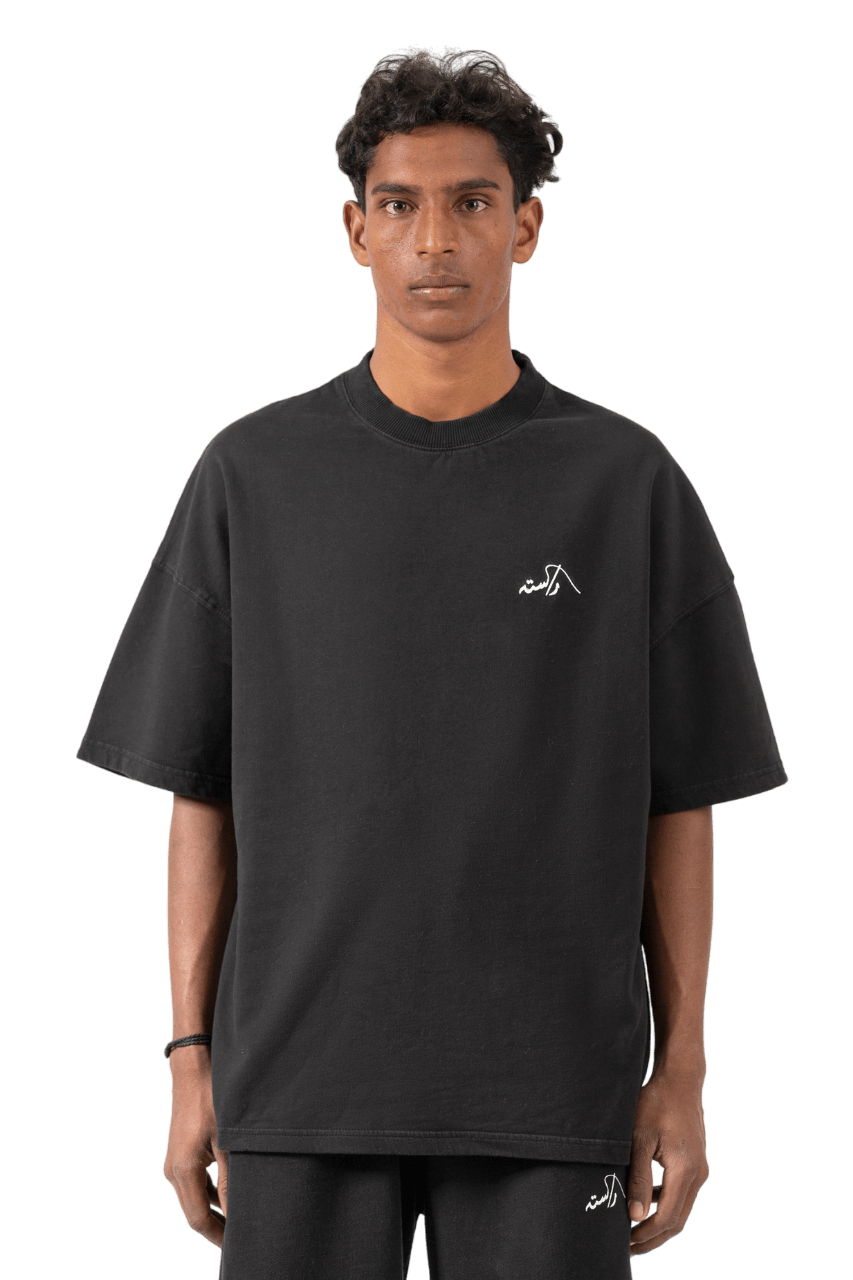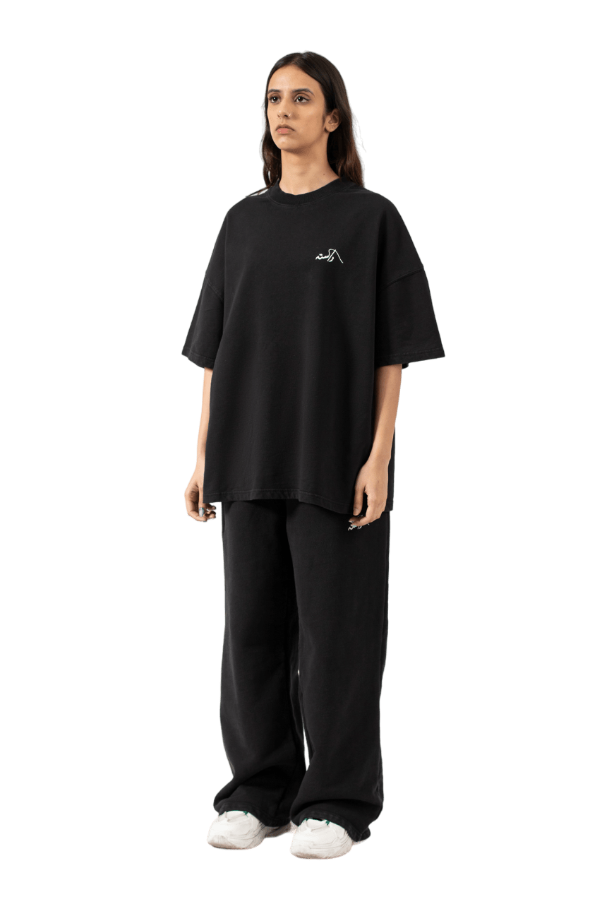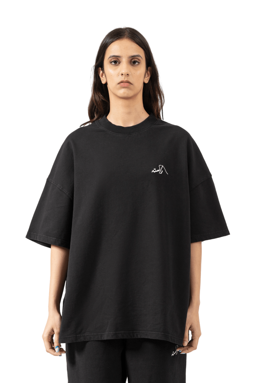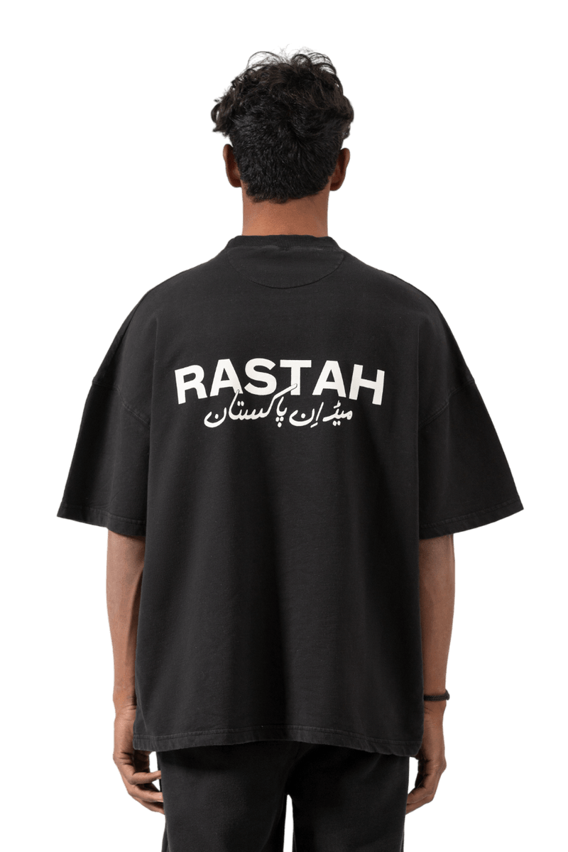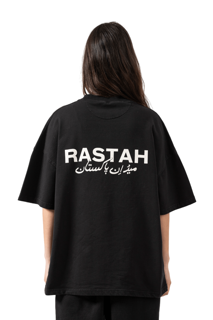 Crafted with meticulous detail, this black t-shirt subtly showcases the Rastah emblem on the front, complemented by the “Made in Pakistan” inscription in elegant Urdu typography on the back. Made from 200 GSM 100% cotton jersey fabric, the shirt offers a soft, breathable feel while maintaining structure and durability. Designed with an oversized fit, it delivers a relaxed yet refined streetwear silhouette. Each garment is garment dyed, reflecting Rastah’s commitment to quality, individuality, and craftsmanship.