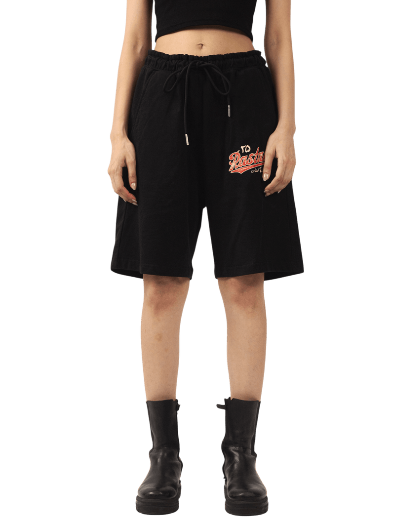 These black shorts bring together raw streetwear energy and crafted detail. Cut from soft washed fleece for a vintage feel, the piece features an oversized "To Rastah" logo in striking orange tones on the left leg. An elasticated waistband with drawcord ensures a comfortable, relaxed fit perfect for everyday wear.
