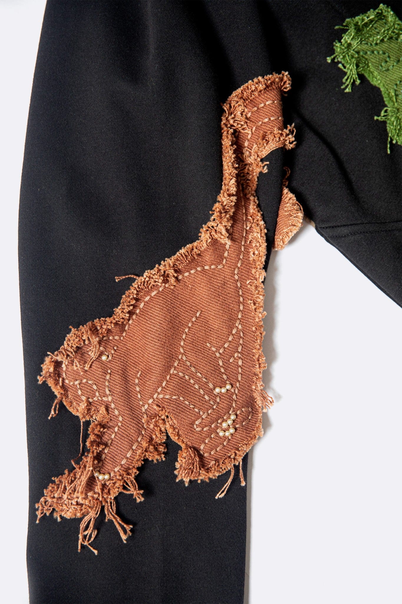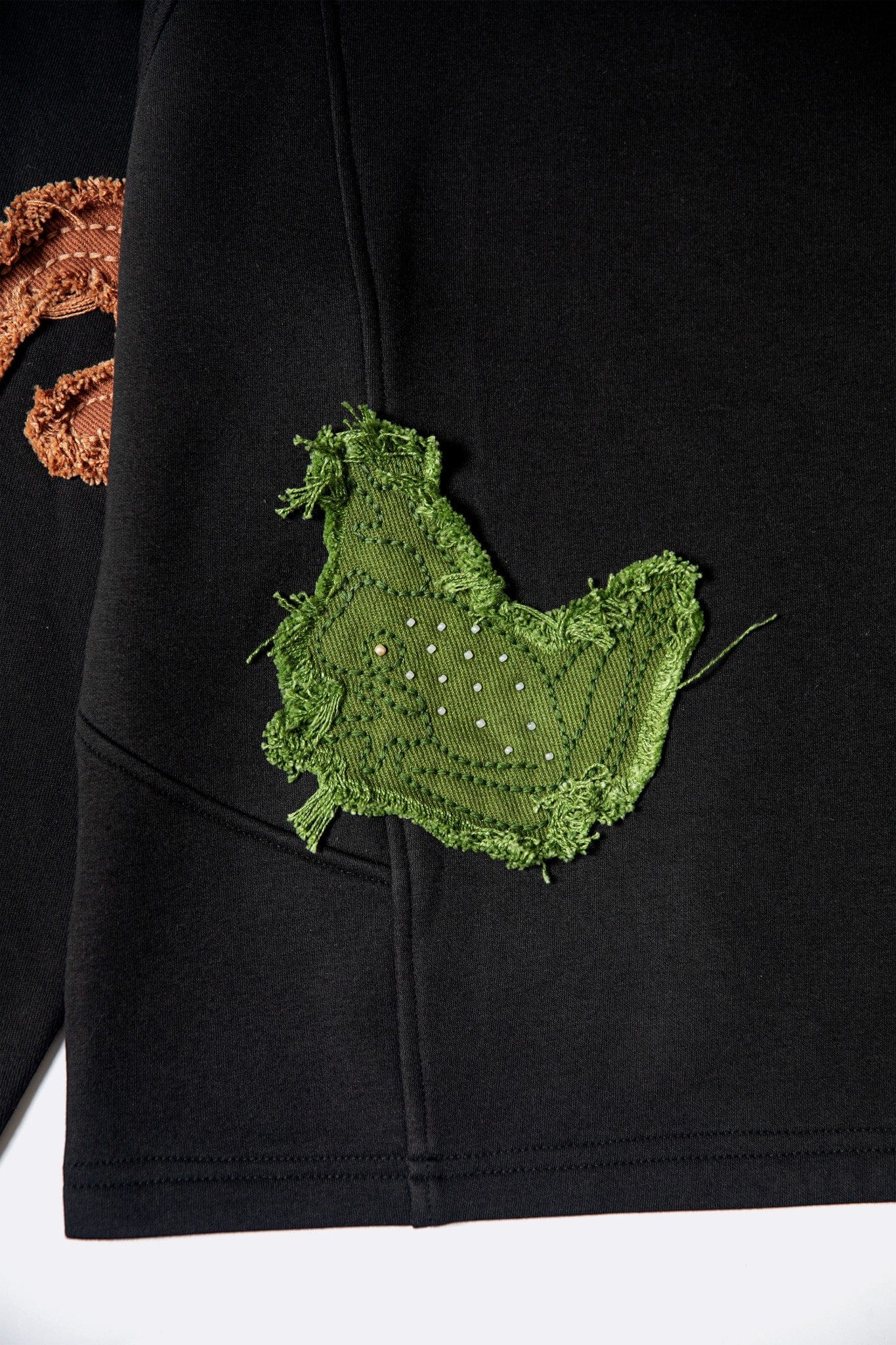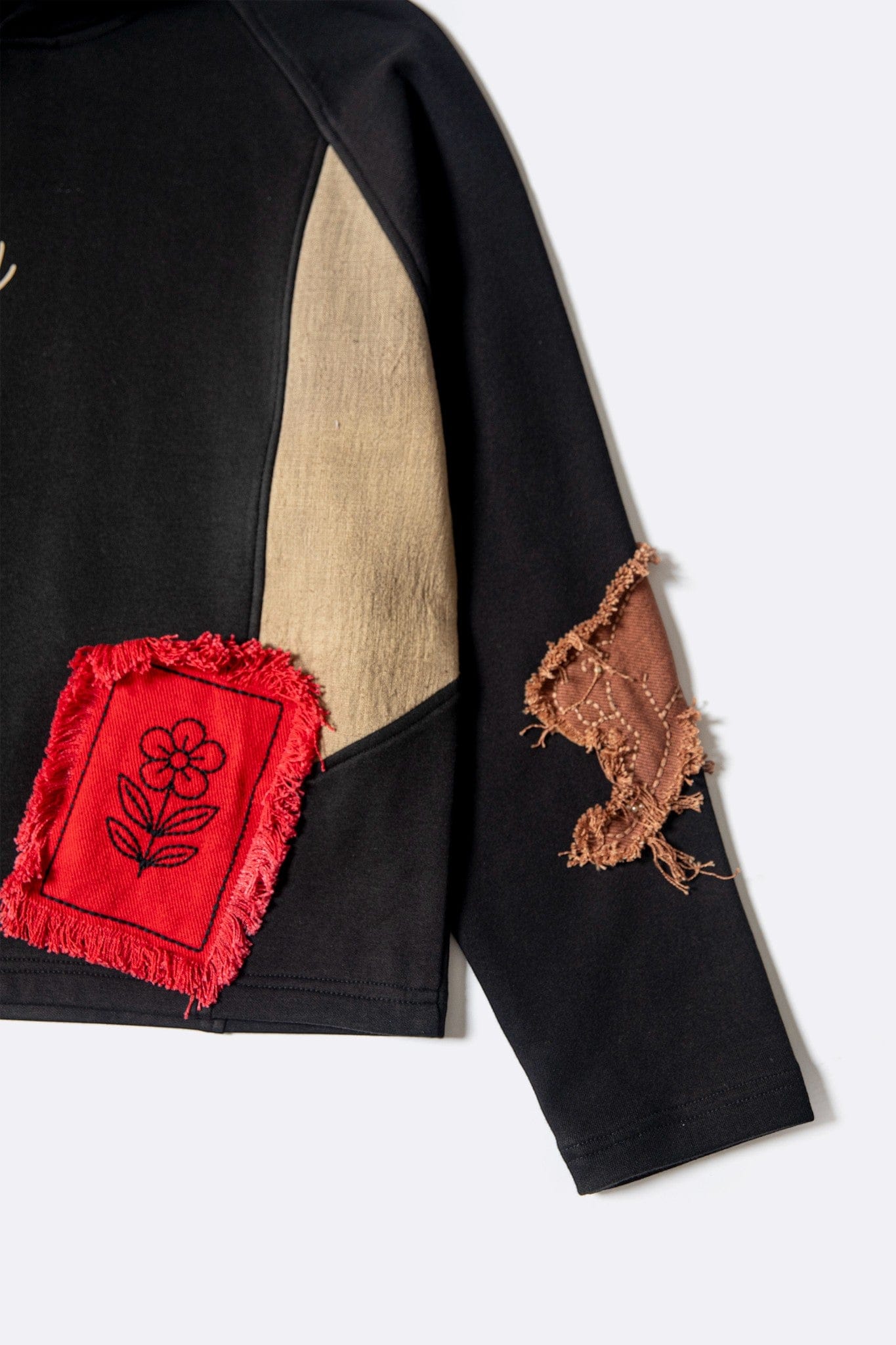 The Borrowed Wit Hoodie is a relaxed, rib-less hoodie constructed with paneled Khaddar blocking at the front. Hand-applied denim patchwork elements including a frog, monkey, and floral motifs layered across the surface, finished with hand embroidery and subtle embellishments. Designed as a soft, sculptural piece where texture and storytelling quietly unfold.
