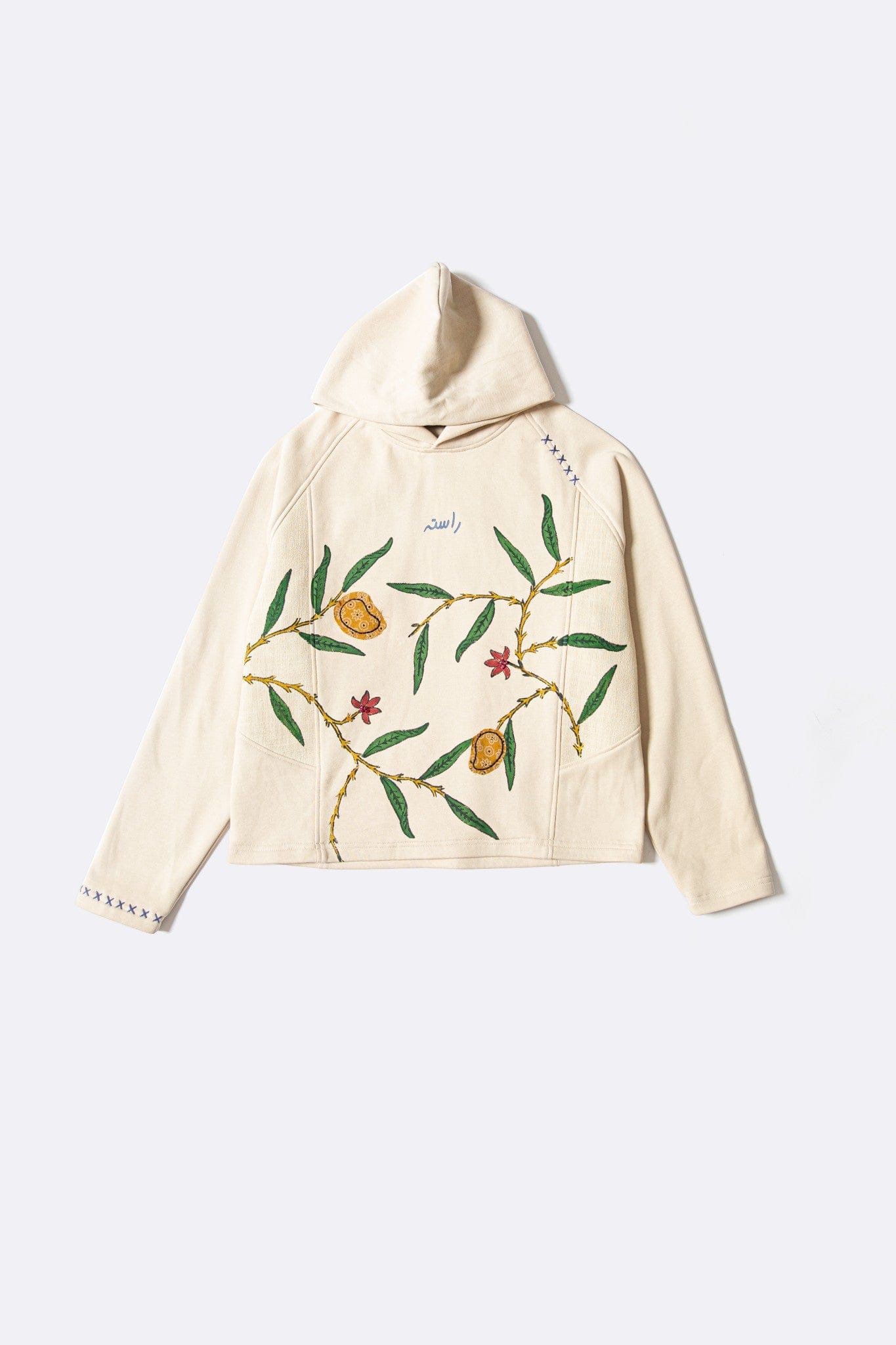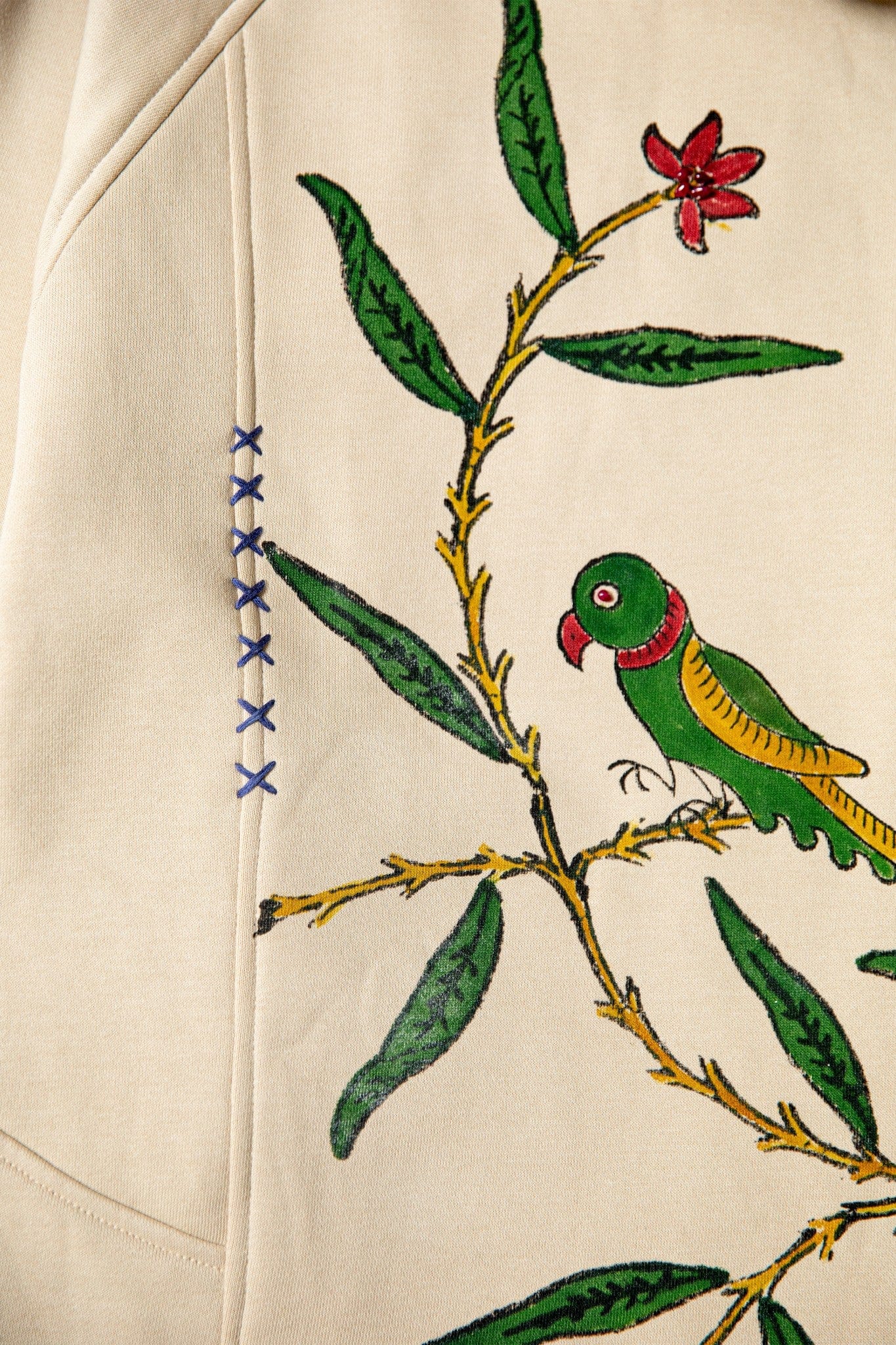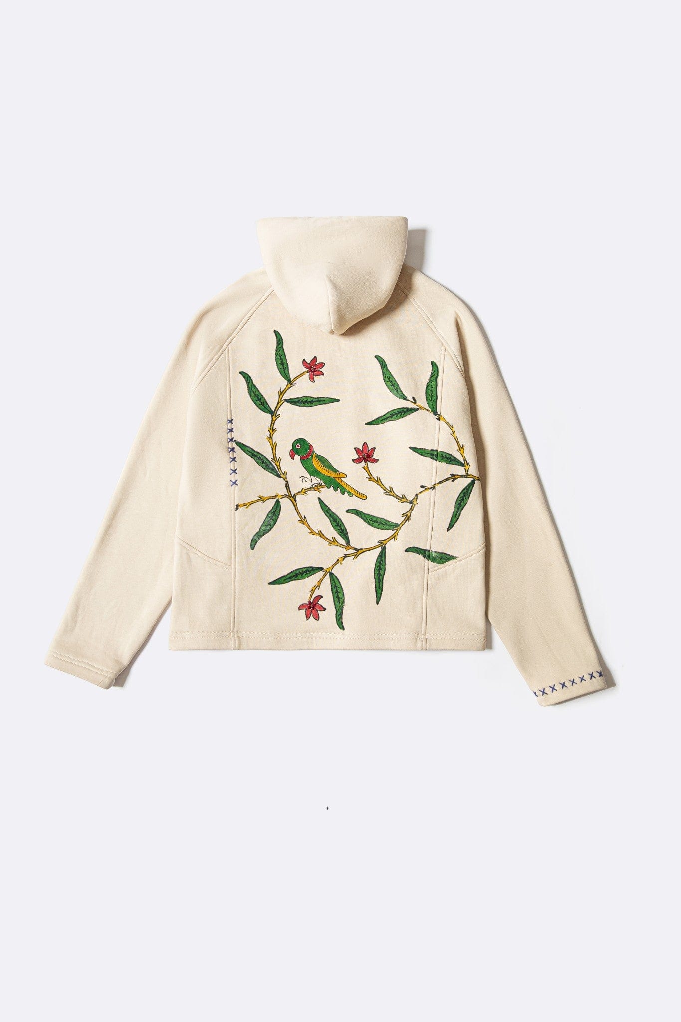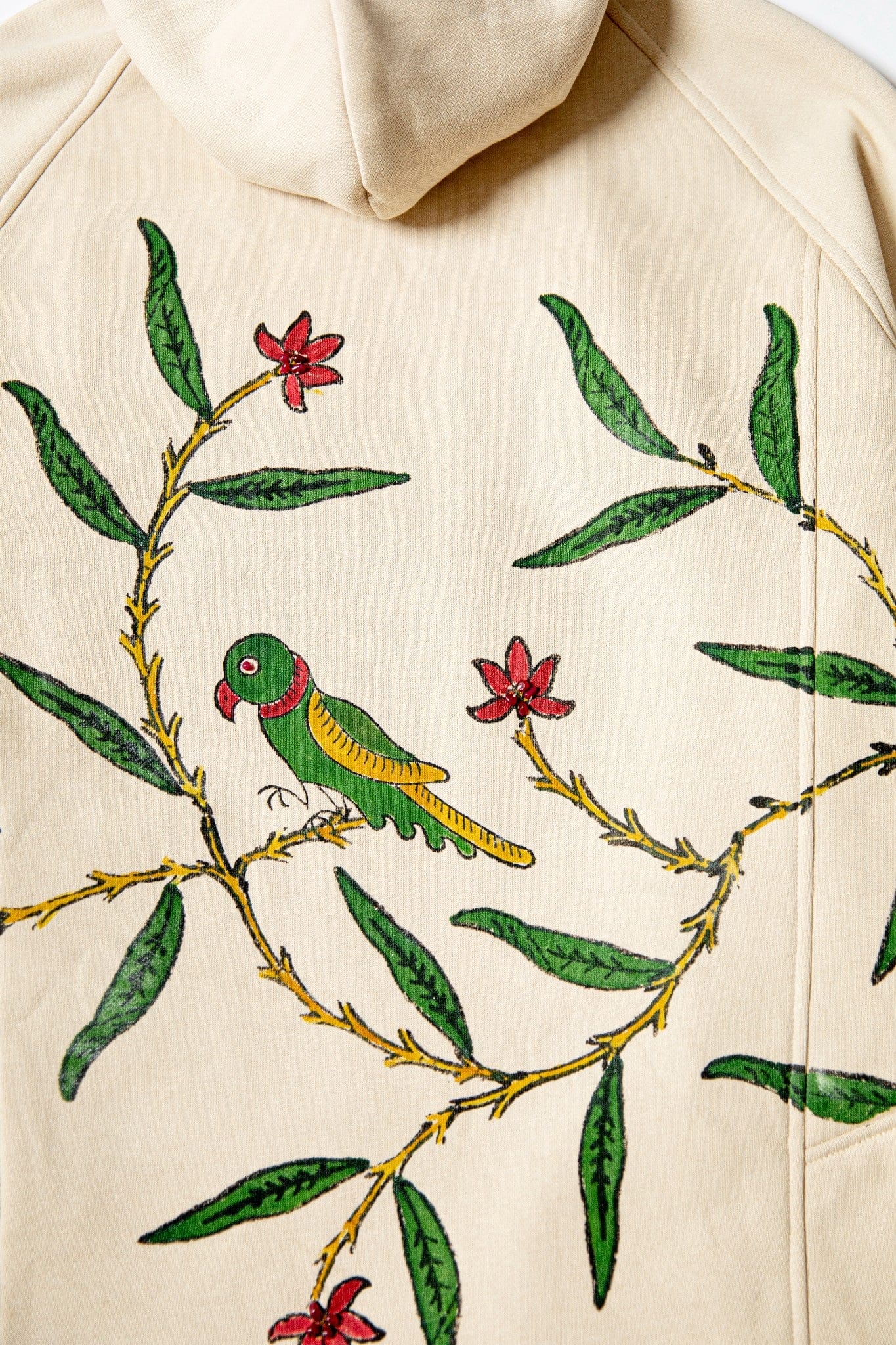A relaxed-fit hoodie featuring all-over block printing inspired by a mango orchard in full bloom. The surface is layered with mango tree motifs, hand-applied mango patches, and a parrot graphic at the back, finished with subtle embellishments across the floral details. The piece draws from Tutinama imagery where abundance and temptation exist side by side.
