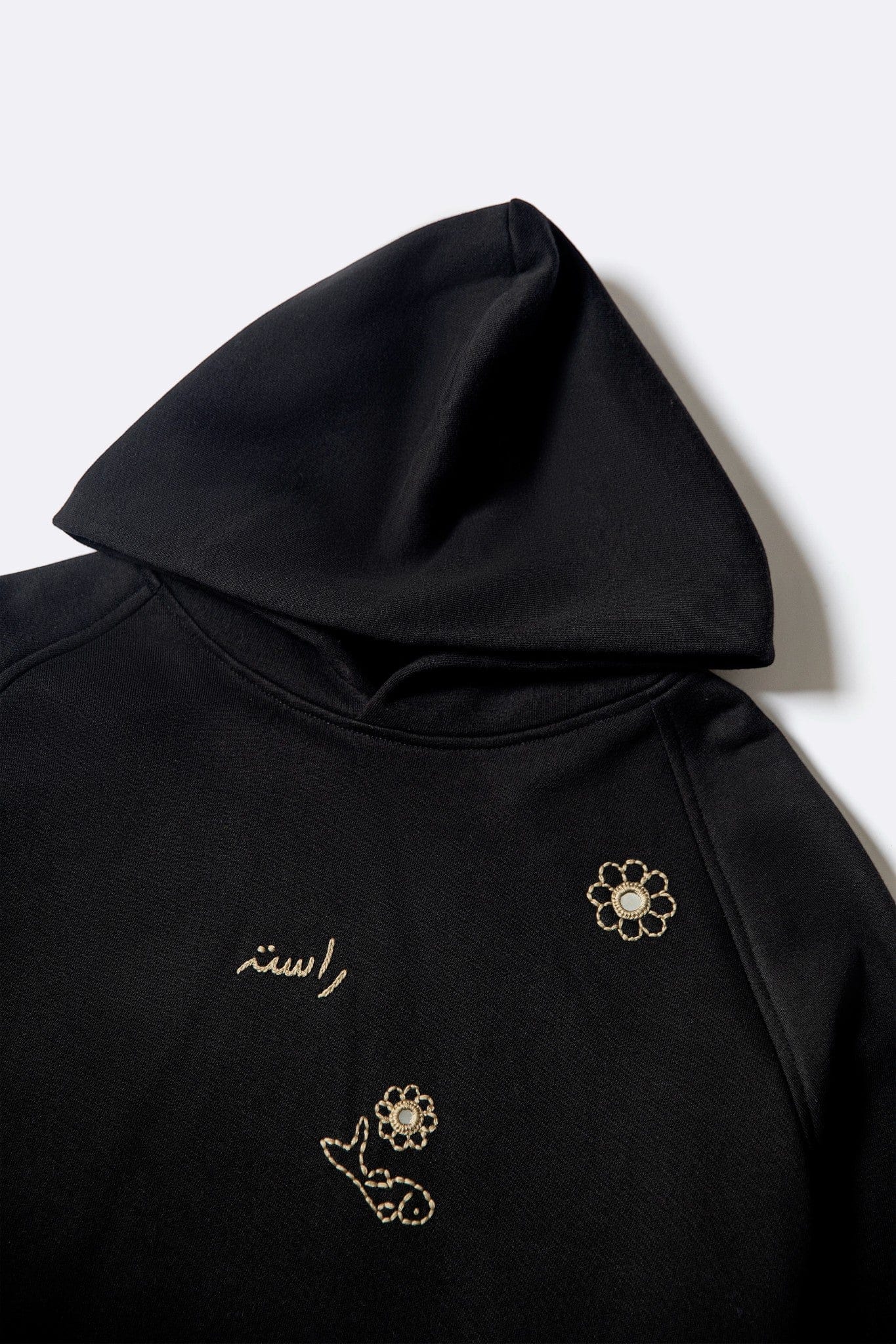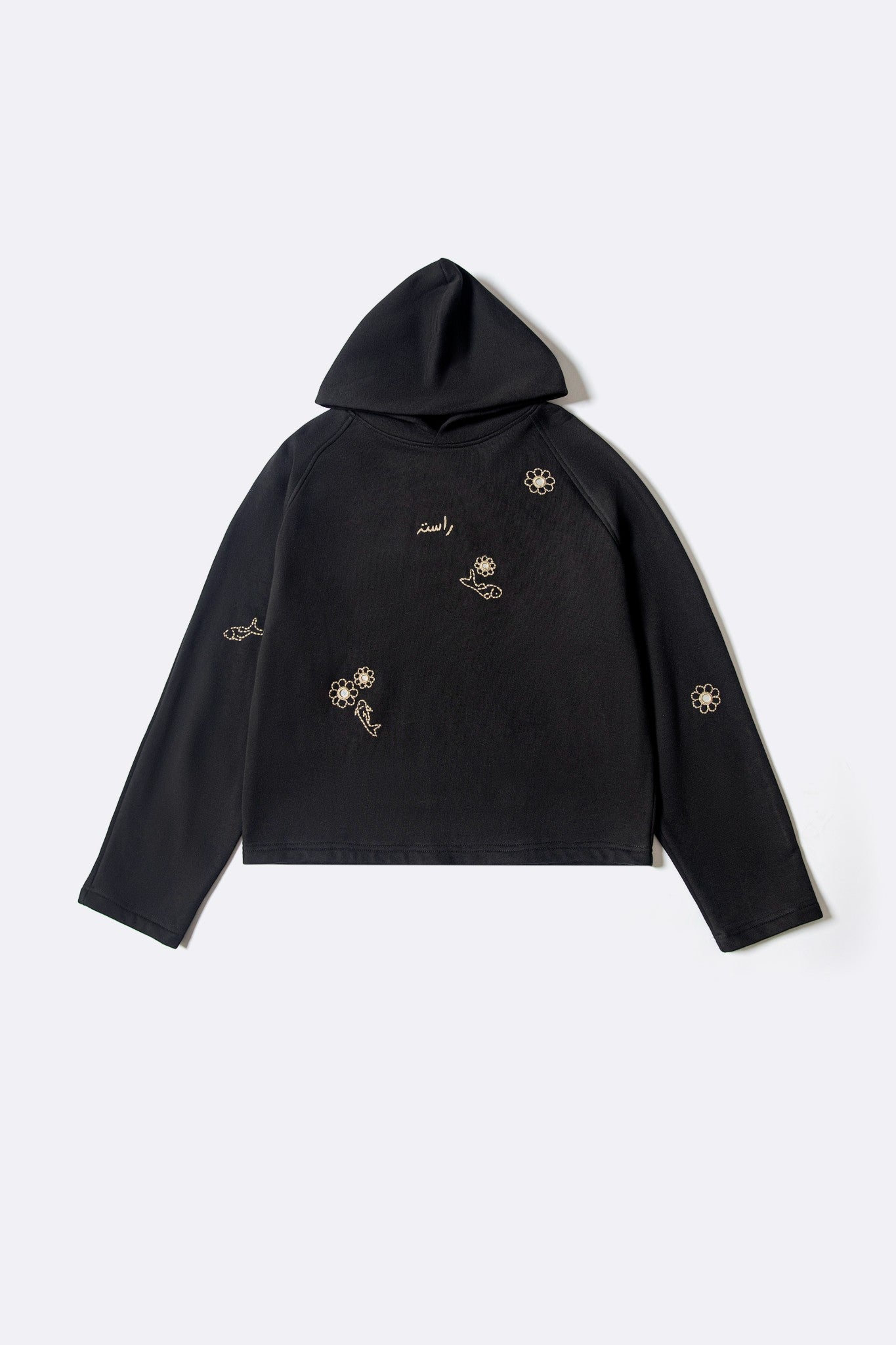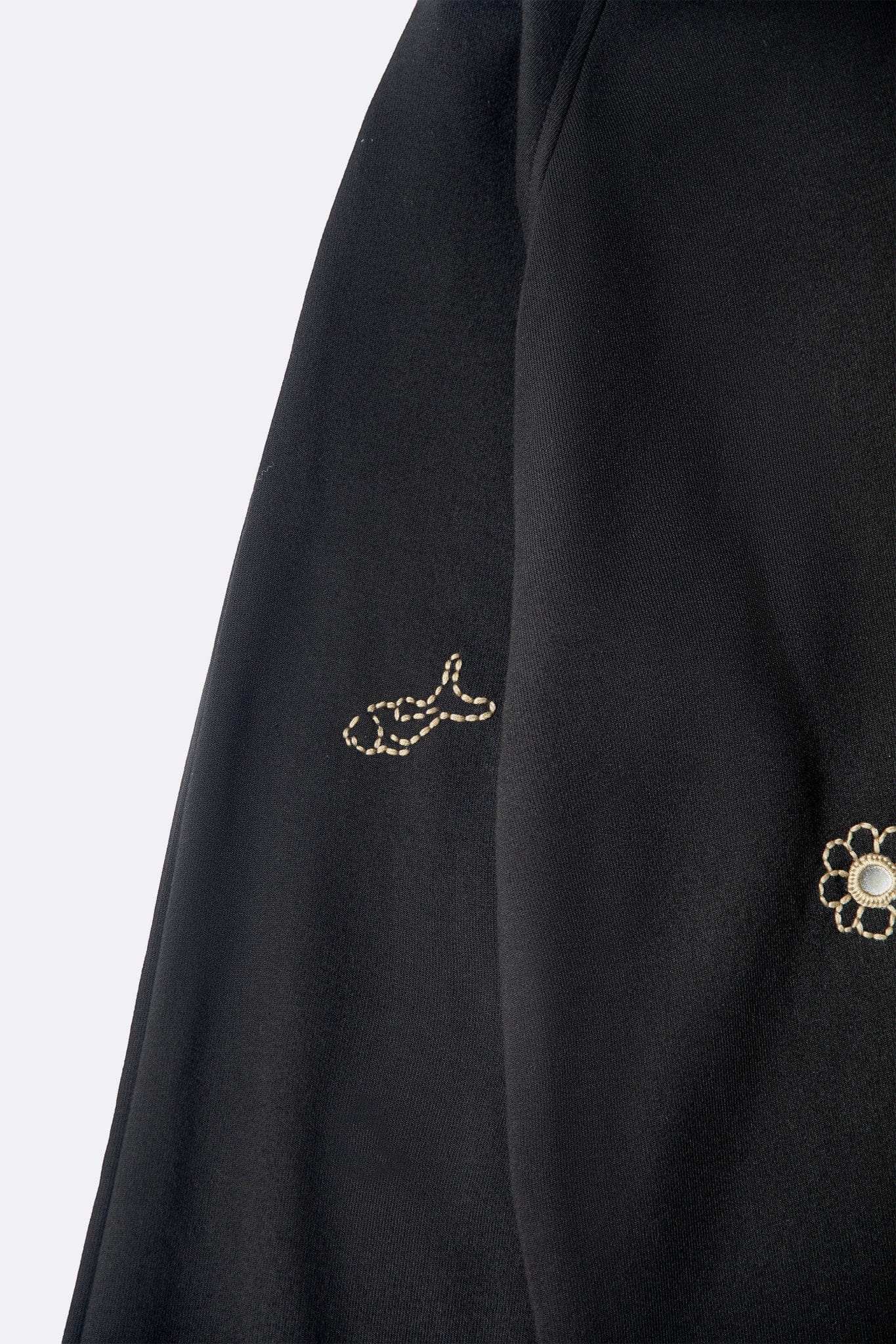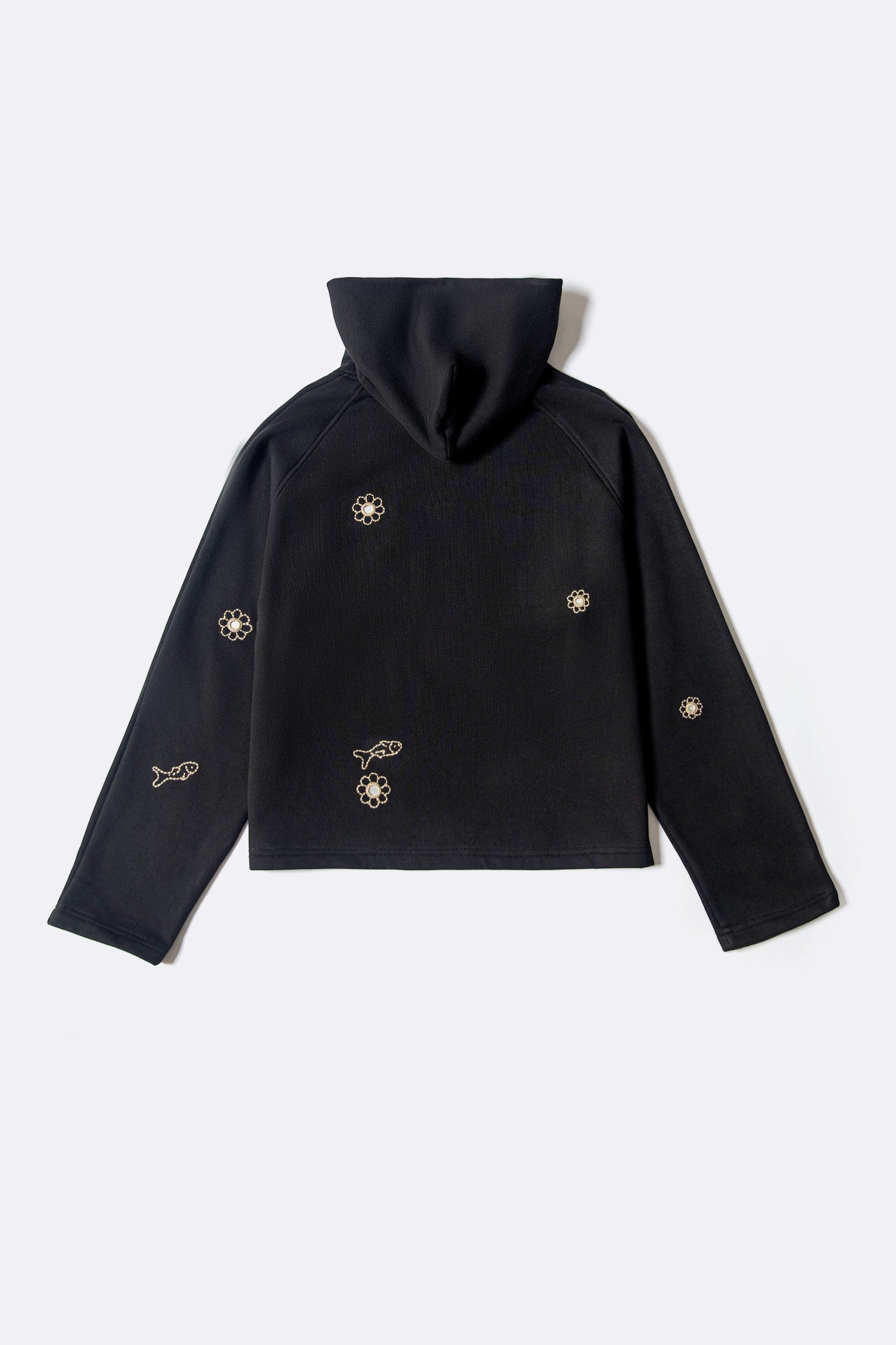 A relaxed-fit hoodie crafted with all-over hand embroidery, featuring fish and floral motifs accented with mirror work. The reflective elements interrupt clarity rather than reveal it, drawing from a Tutinama tale where reflection is deliberately withheld.
