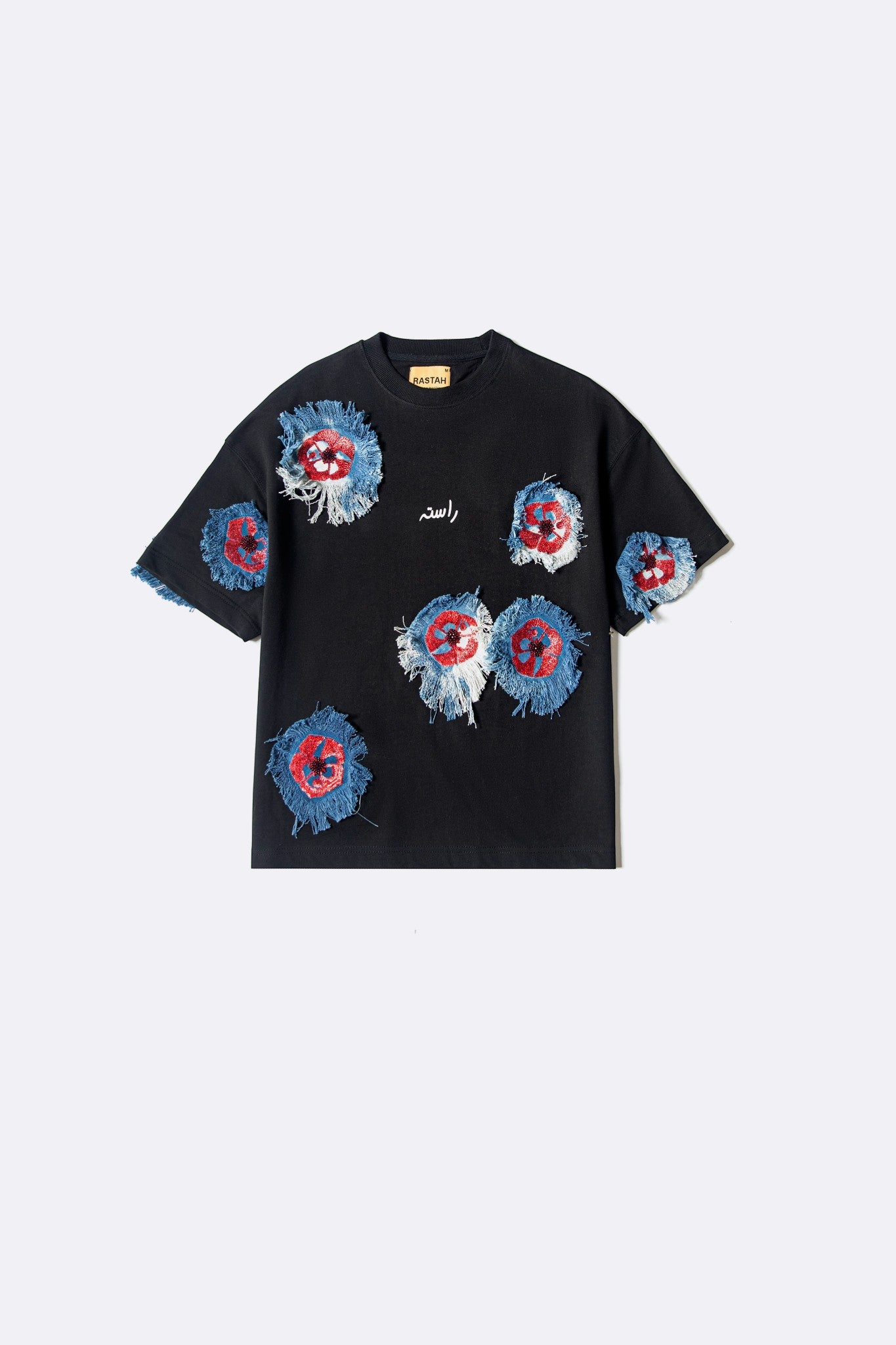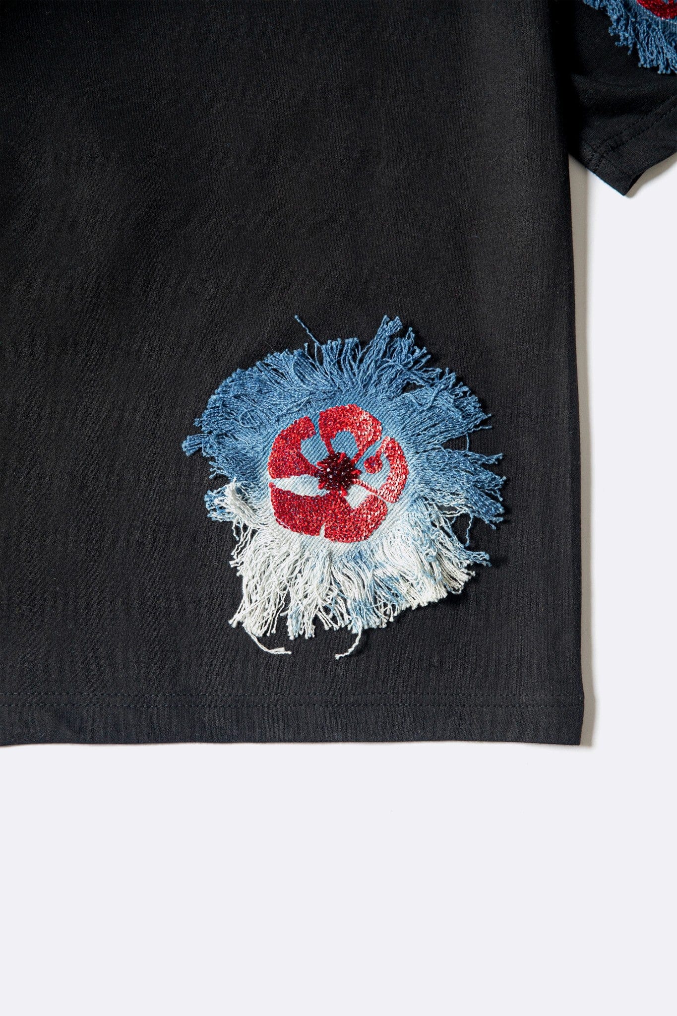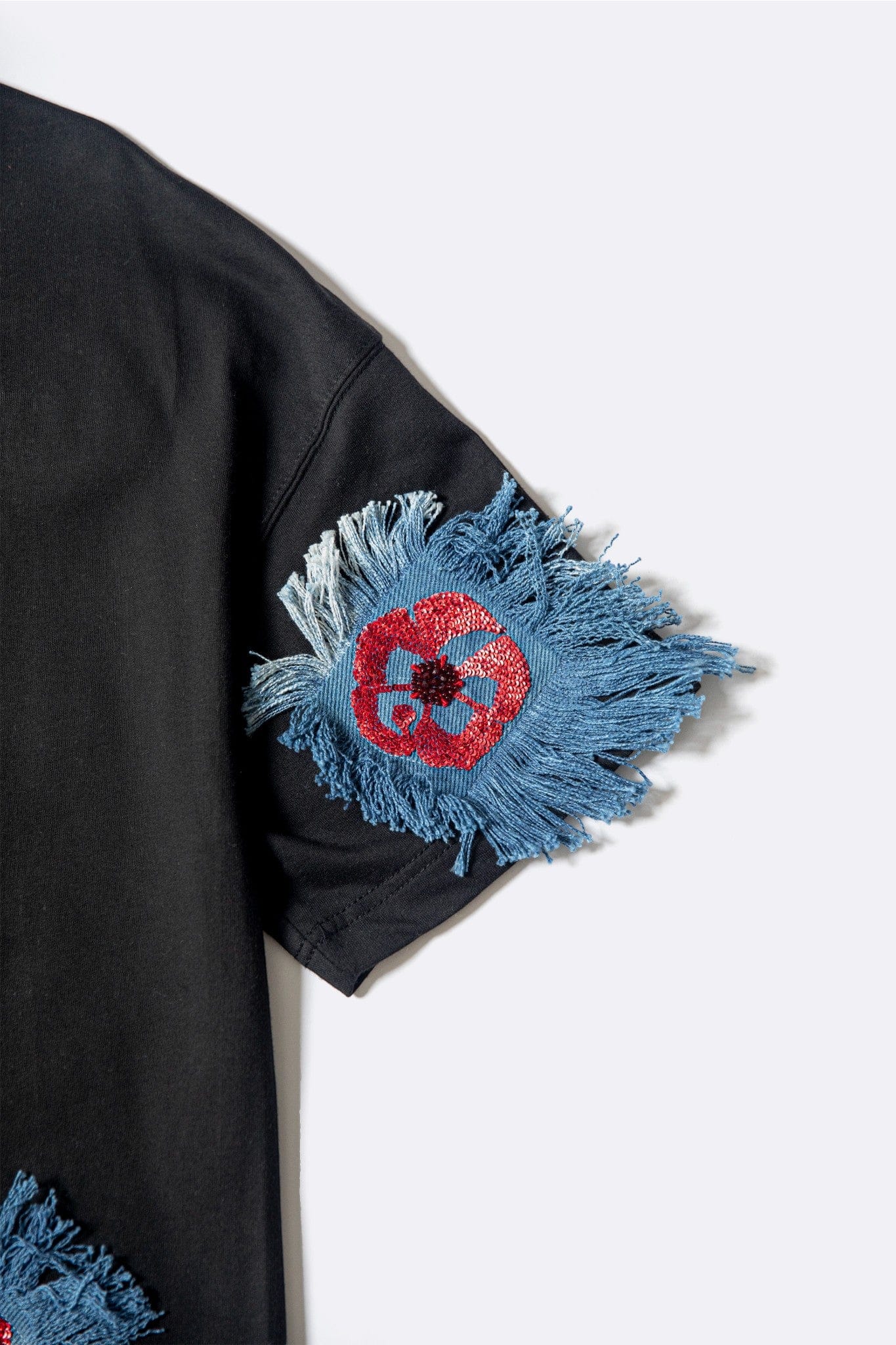 Scar Garden is built around beauty that endured damage. Distressed denim patches are hand tie-dyed, embellished, and stitched onto a black cotton base—each motif resembling a flower that bloomed after ruin. Inspired by Titunama’s recurring idea of forbidden beauty and irreversible consequence, this piece treats ornament as a wound, not decoration.