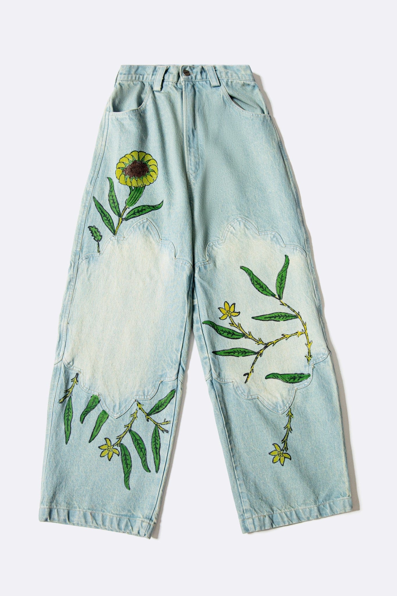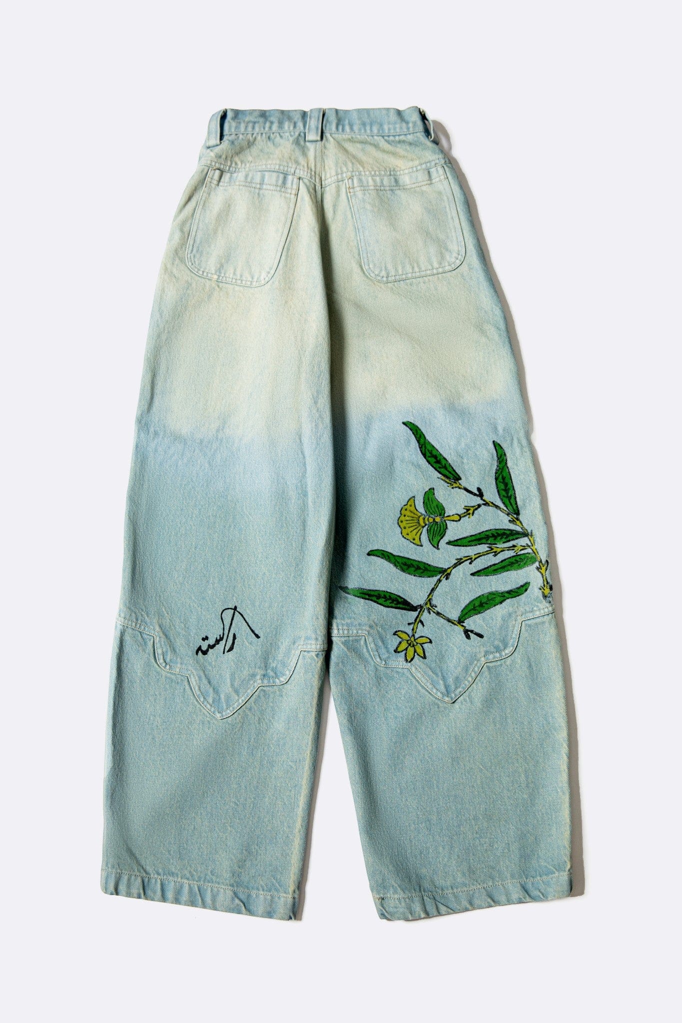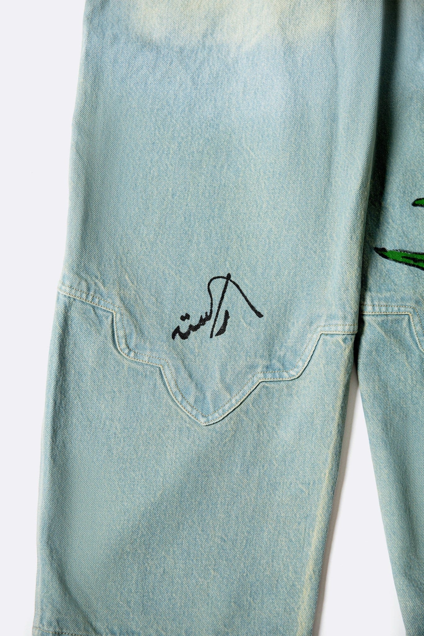 Denim-washed jeans featuring Mughal-inspired arch paneling and hand block-printed motifs. Designed in a barrel fit, the silhouette balances structure and ease while echoing the Sunlit Flight story through movement and form.