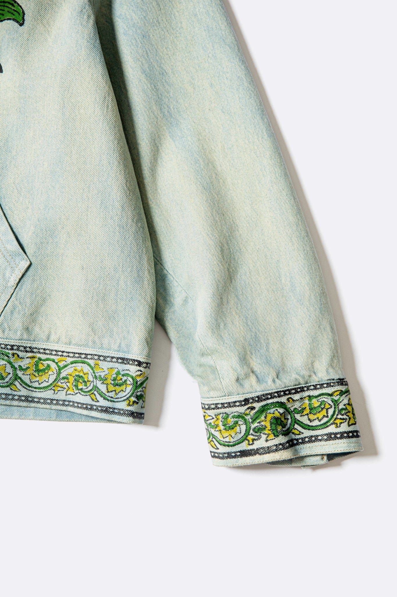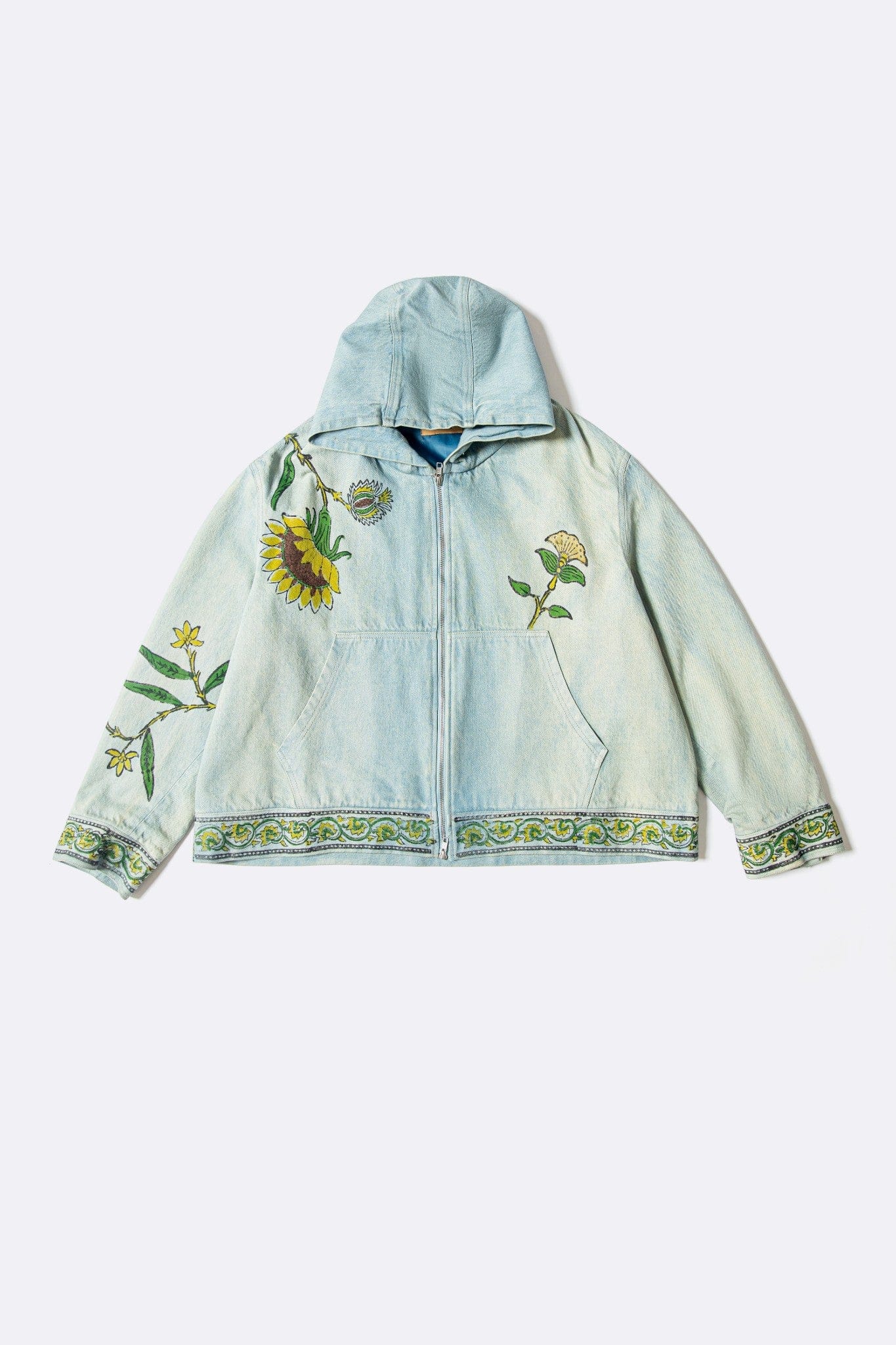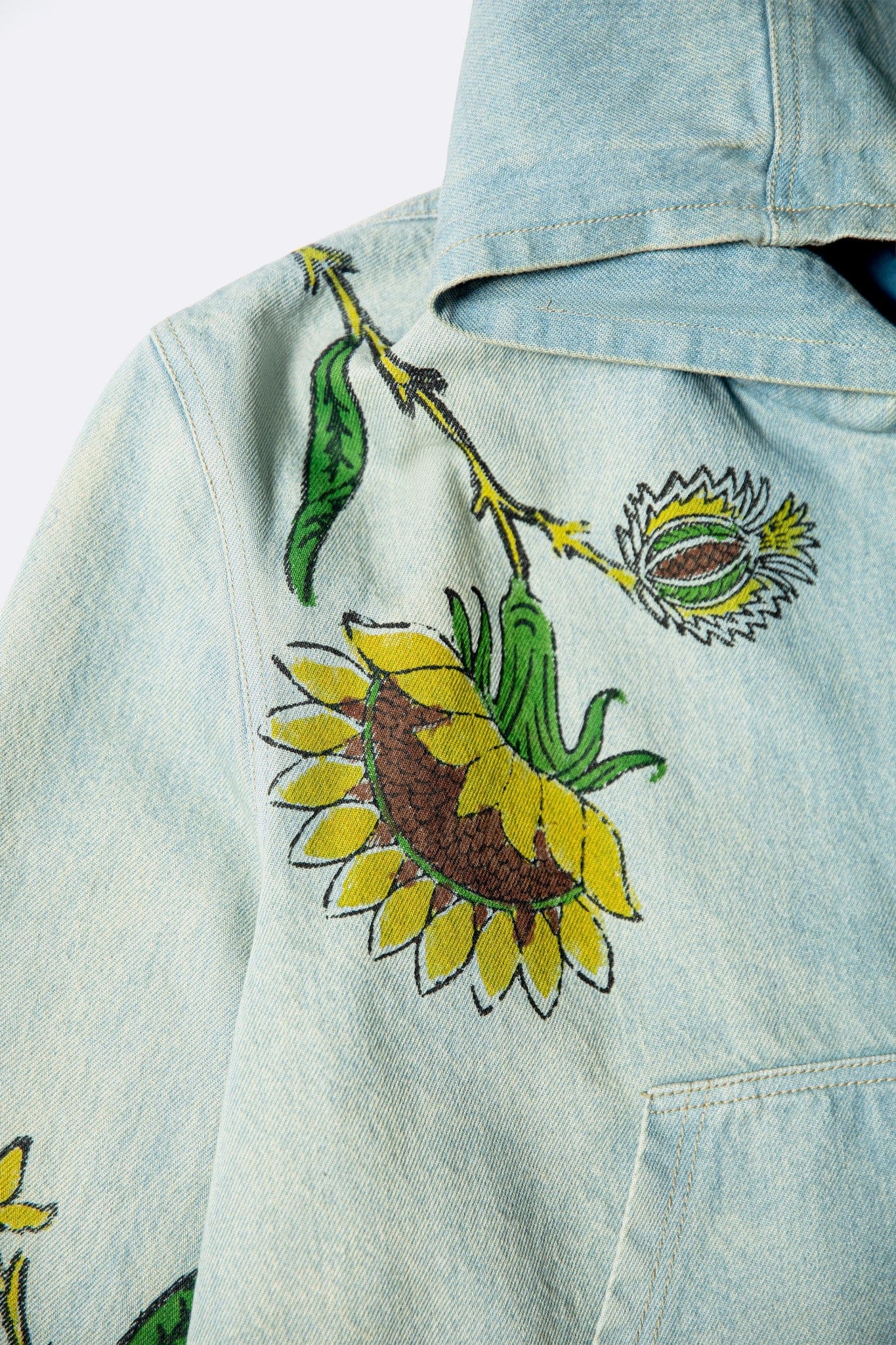 A denim-washed zipper hoodie jacket brought to life with block-printed sunflowers and a parrot motif resting along the sleeve. Inspired by Tutinama’s quieter moments of pause and passage, the piece captures warmth, movement, and the feeling of a journey paused under open sky.