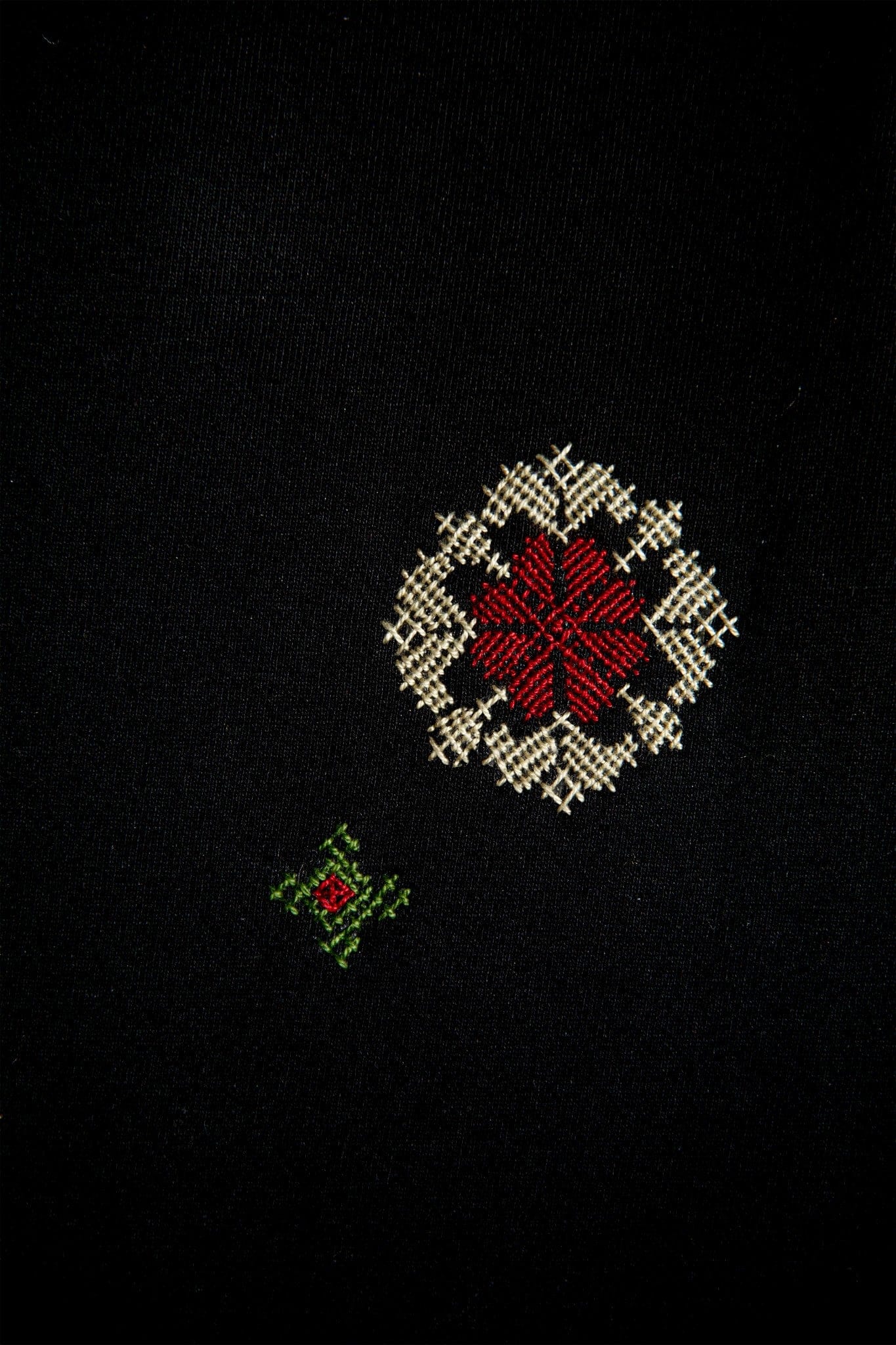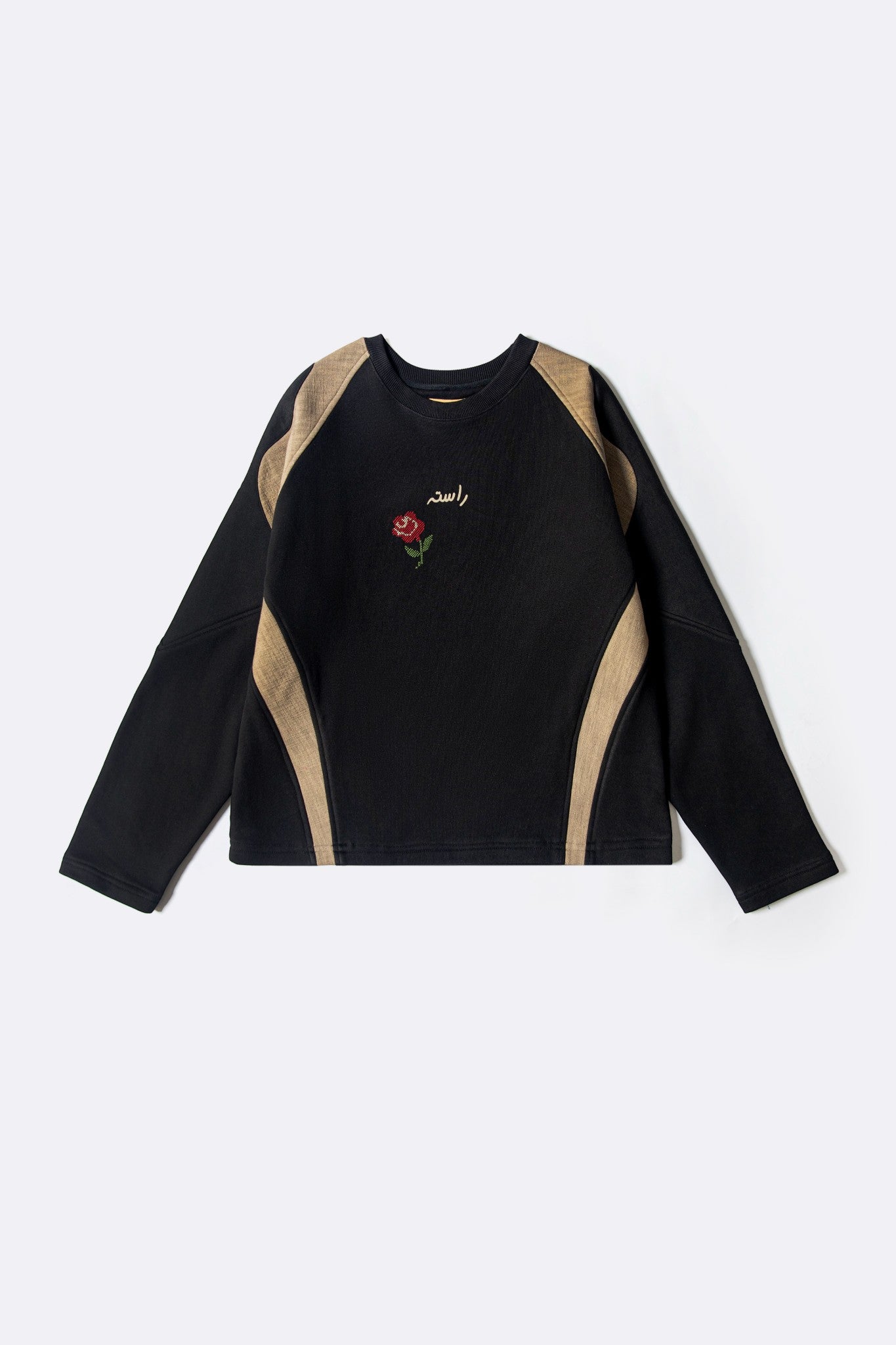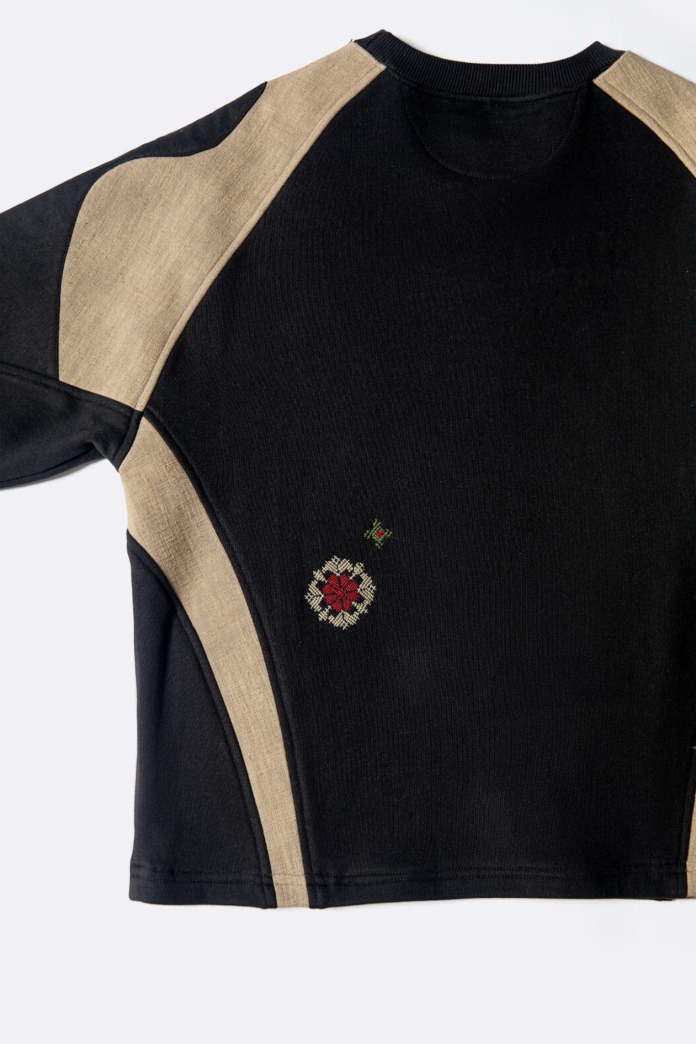 A fleece sweatshirt featuring khaddar-paneled construction that traces a serpent-like form across the shoulders and sleeves. Cross-stitch embroidery introduces a red rose motif—drawn from Tutinama tales of forbidden desire, disappearance, and the silence that follows temptation.
