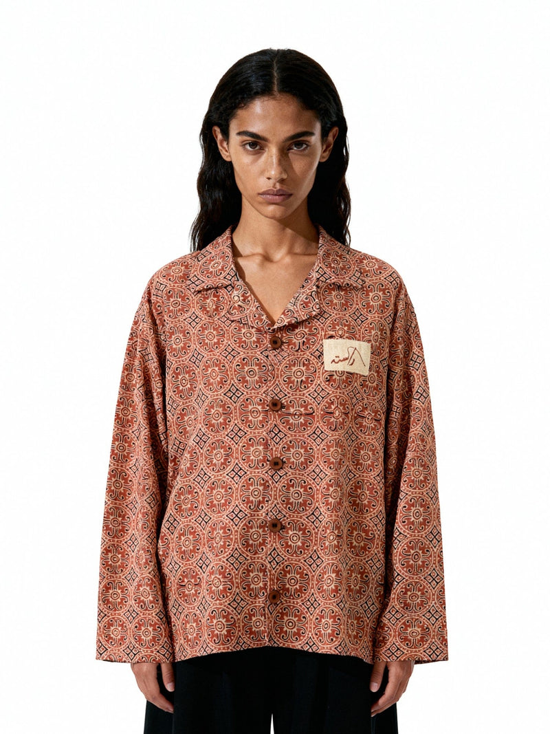 The Ajrak Heritage Shirt is a celebration of Sindhi artistry, crafted from hand-printed fabric featuring intricate geometric motifs. Each print captures centuries of cultural storytelling through form and rhythm. The design is completed with a screen-printed logo patch that subtly grounds tradition in a contemporary frame — an effortless blend of craft and modern wearability.