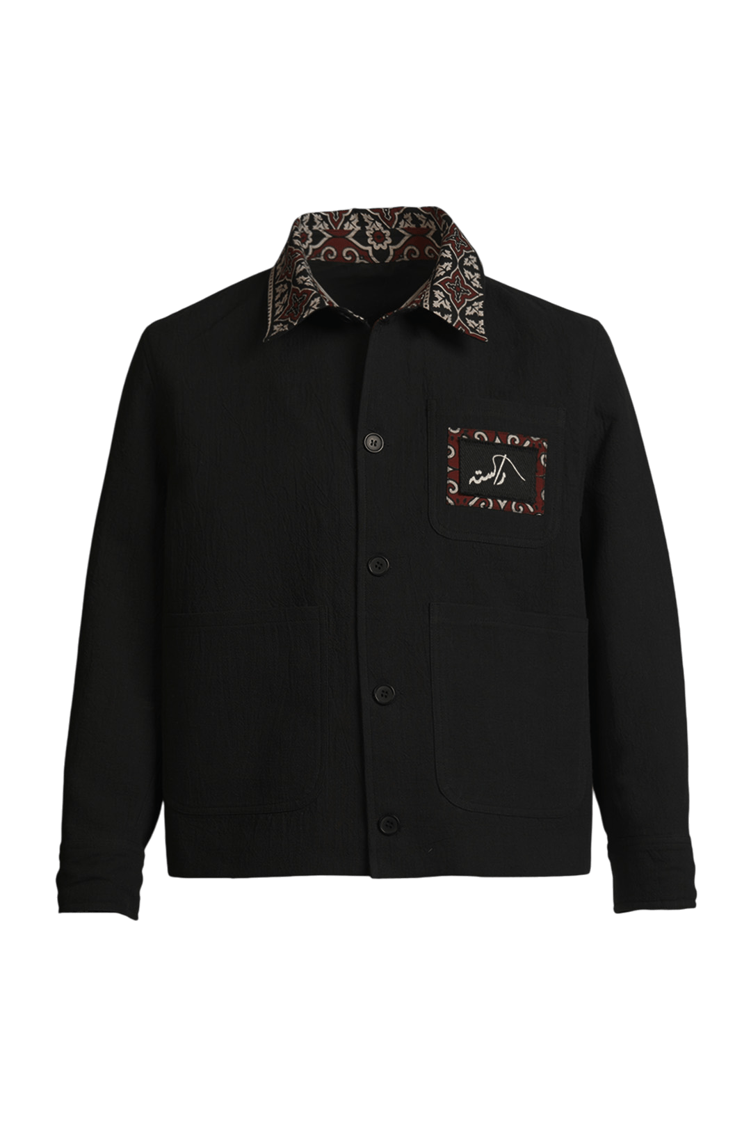 Block-printed collar and chest pocket patch with regional motifs