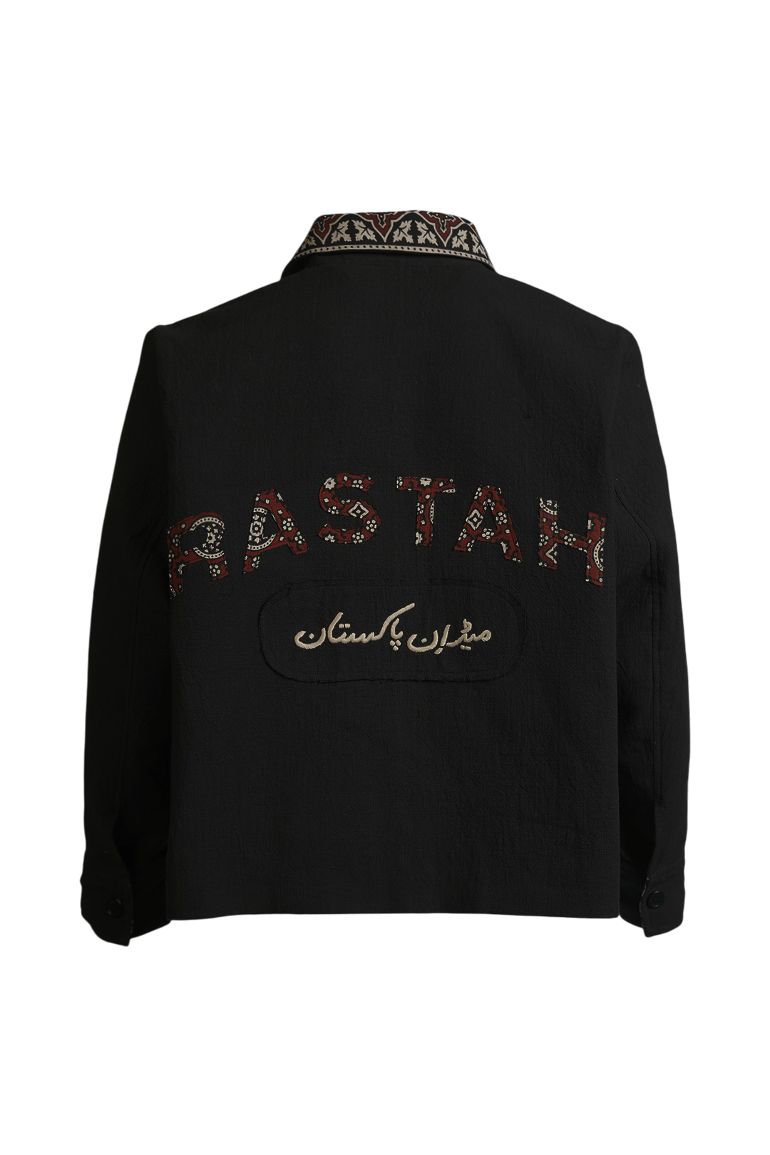 This black khaddar jacket is a celebration of form and heritage. Featuring bold RASTAH laser-cut text on the back and block-printed detailing on the collar and chest patch, it seamlessly fuses tradition with contemporary edge. The hand-textured khaddar fabric offers structure and breathability, while the rich black hue anchors the jacket in understated elegance. It’s a piece that’s designed to turn heads — whether layered for streetwear or styled for refined statements.