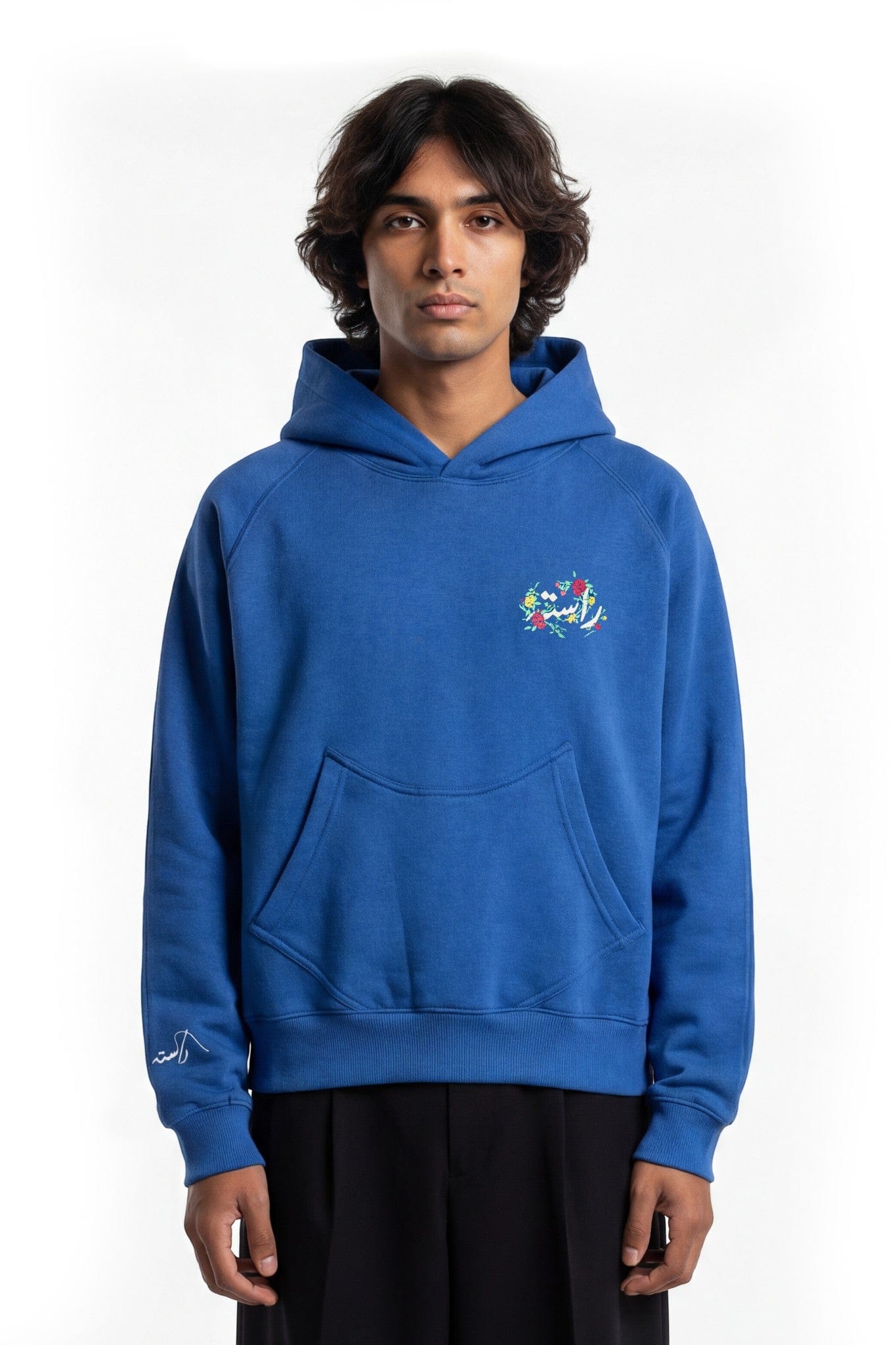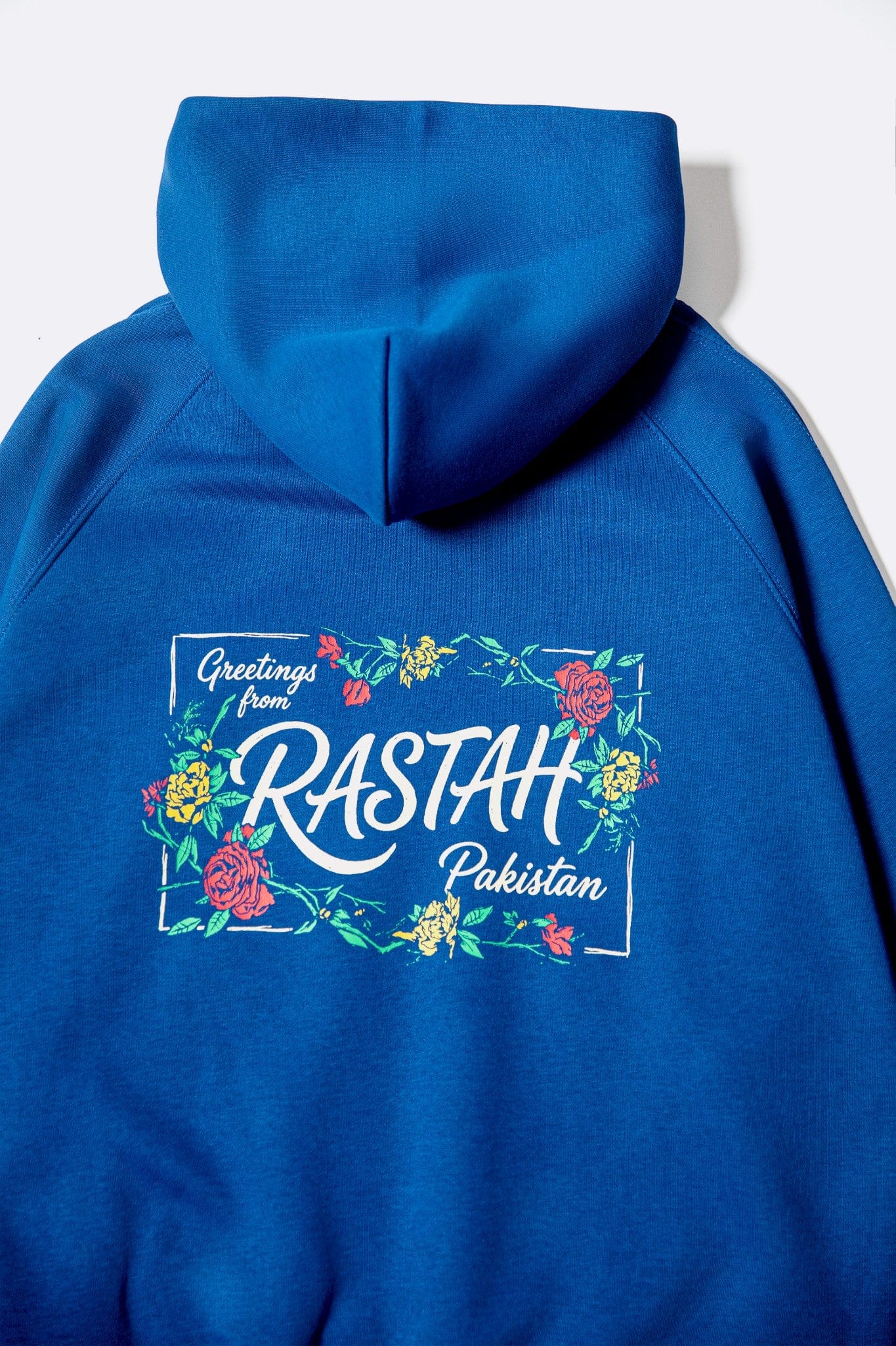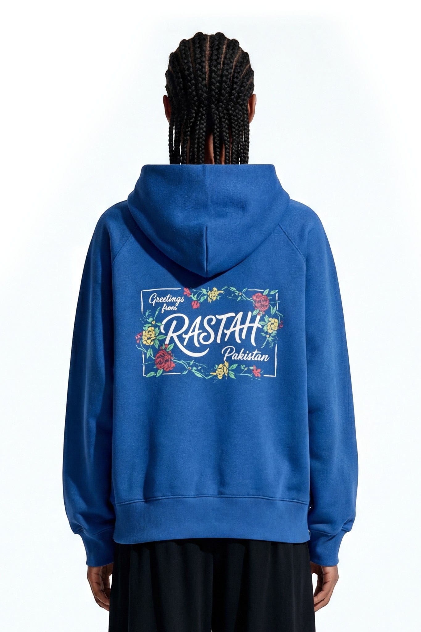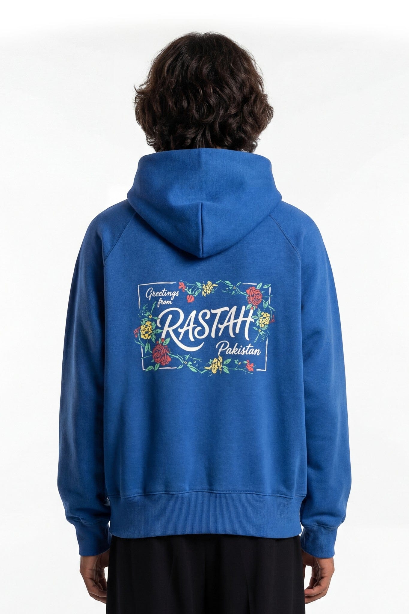 The back features a bold postcard-inspired screen print reading “Greetings from Rastah Pakistan,” framed with floral graphics reminiscent of vintage travel memorabilia. A smaller floral Rastah insignia appears on the front, creating a balanced and refined finish. Designed as a modern souvenir piece, this hoodie blends cultural pride with a global streetwear aesthetic.