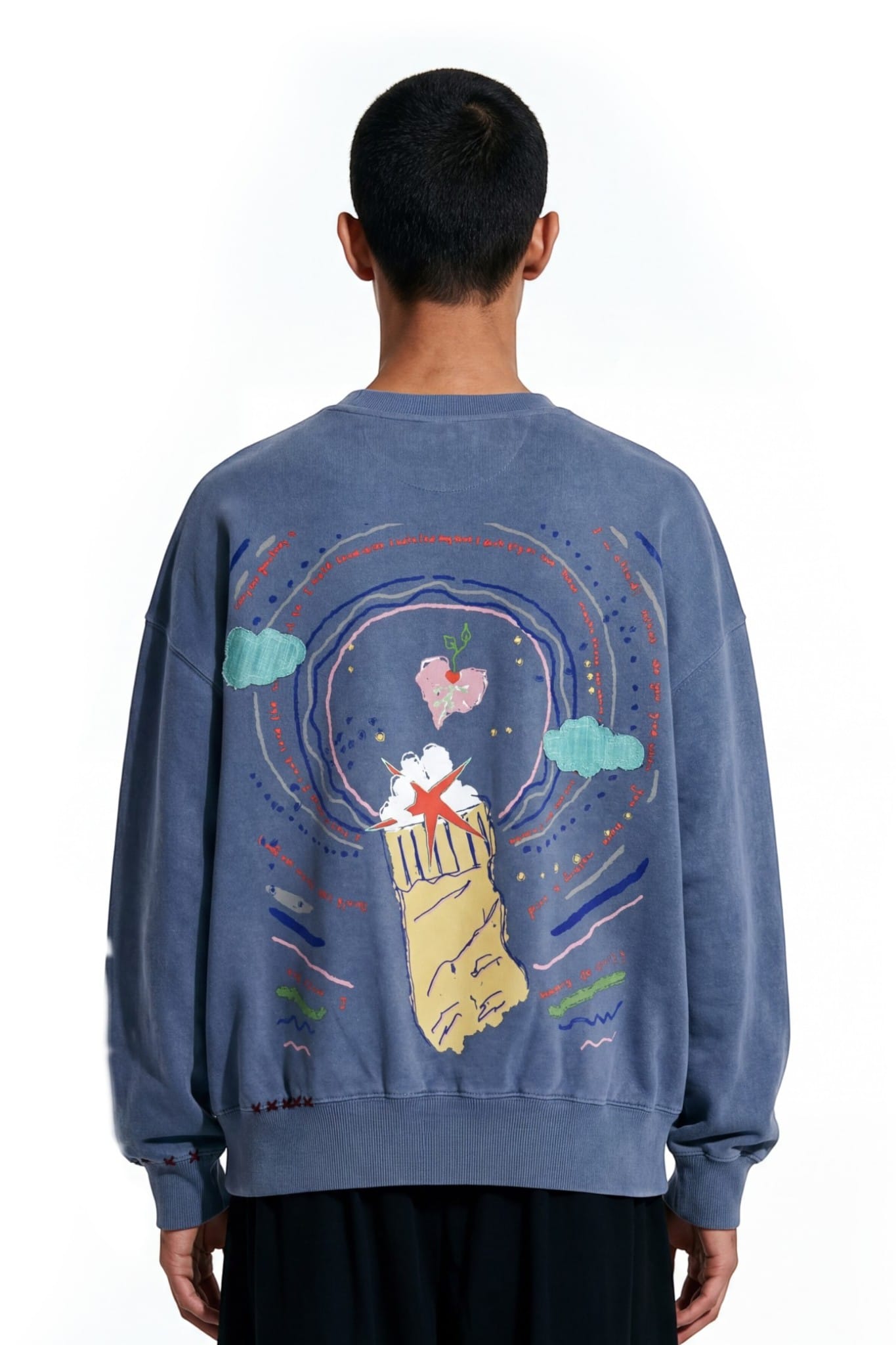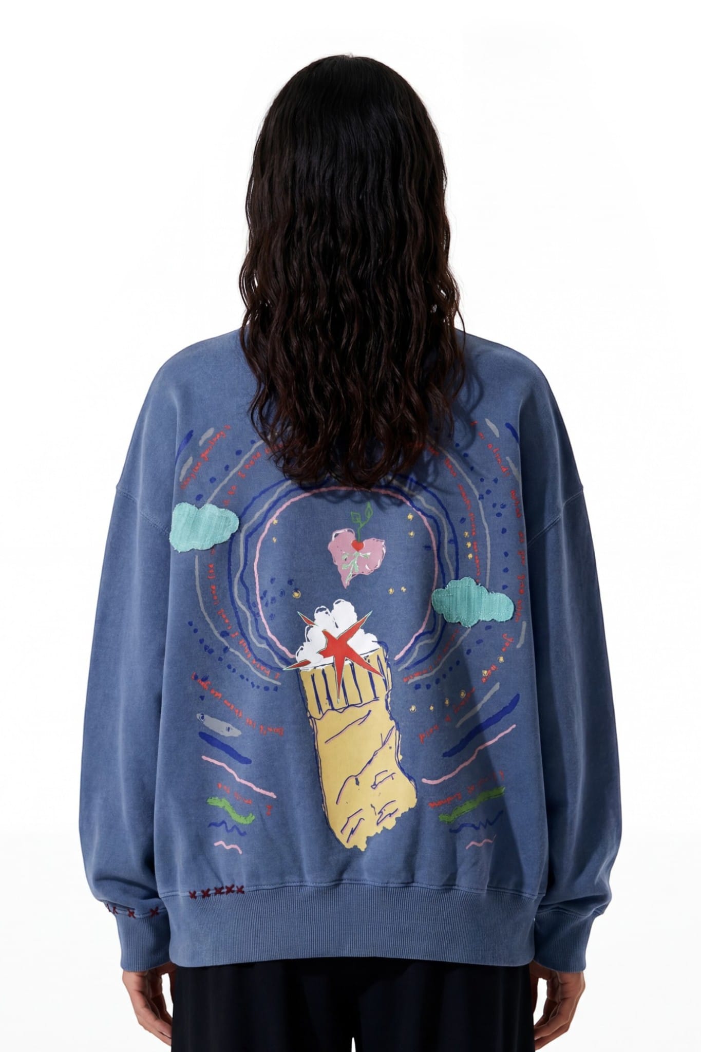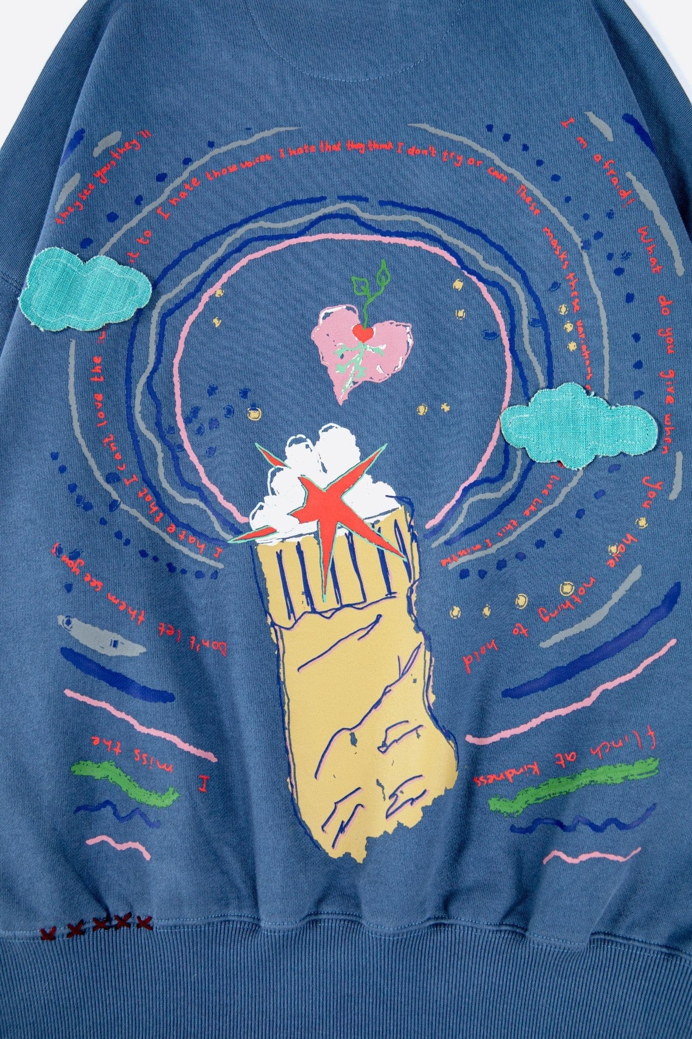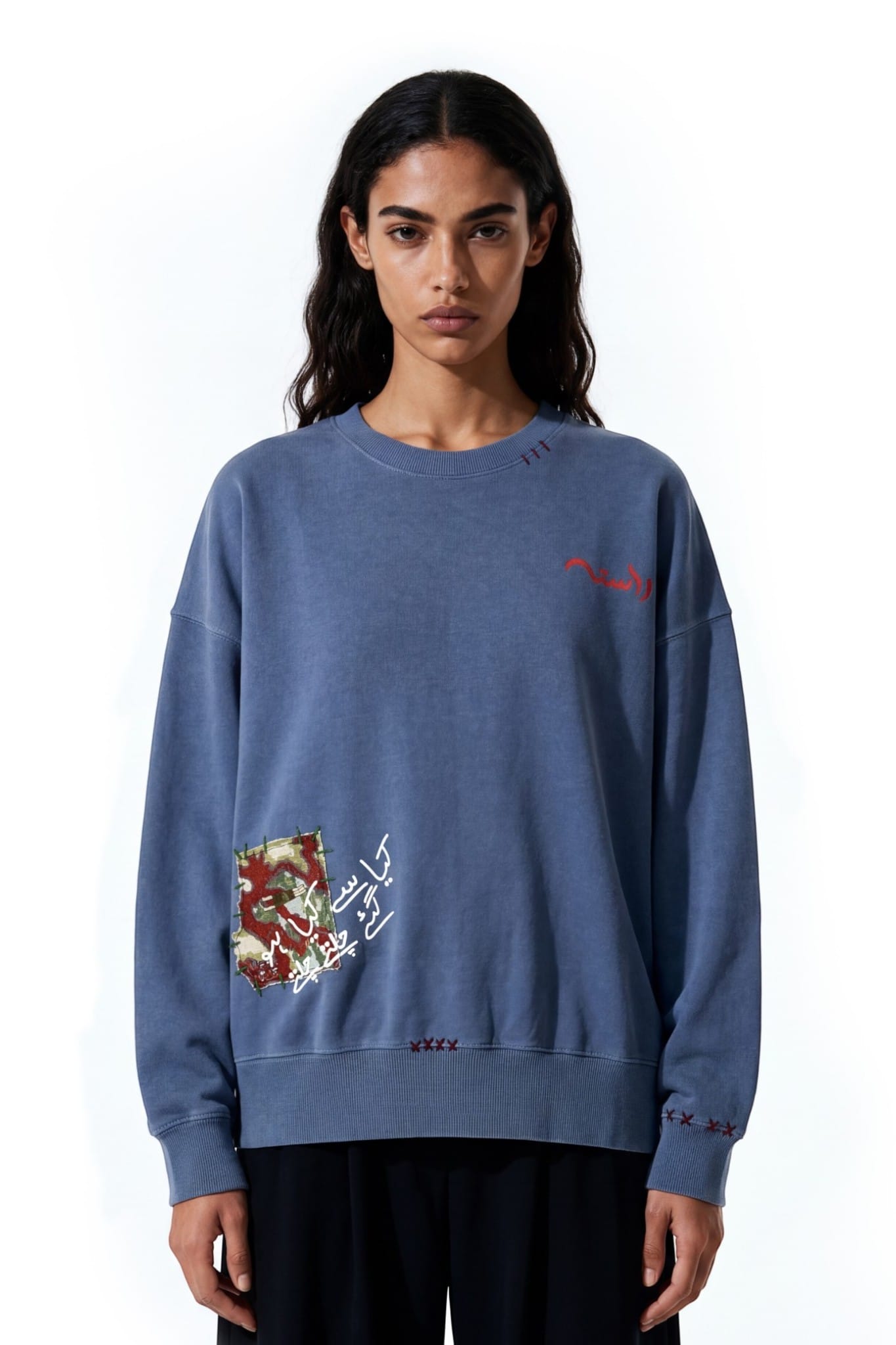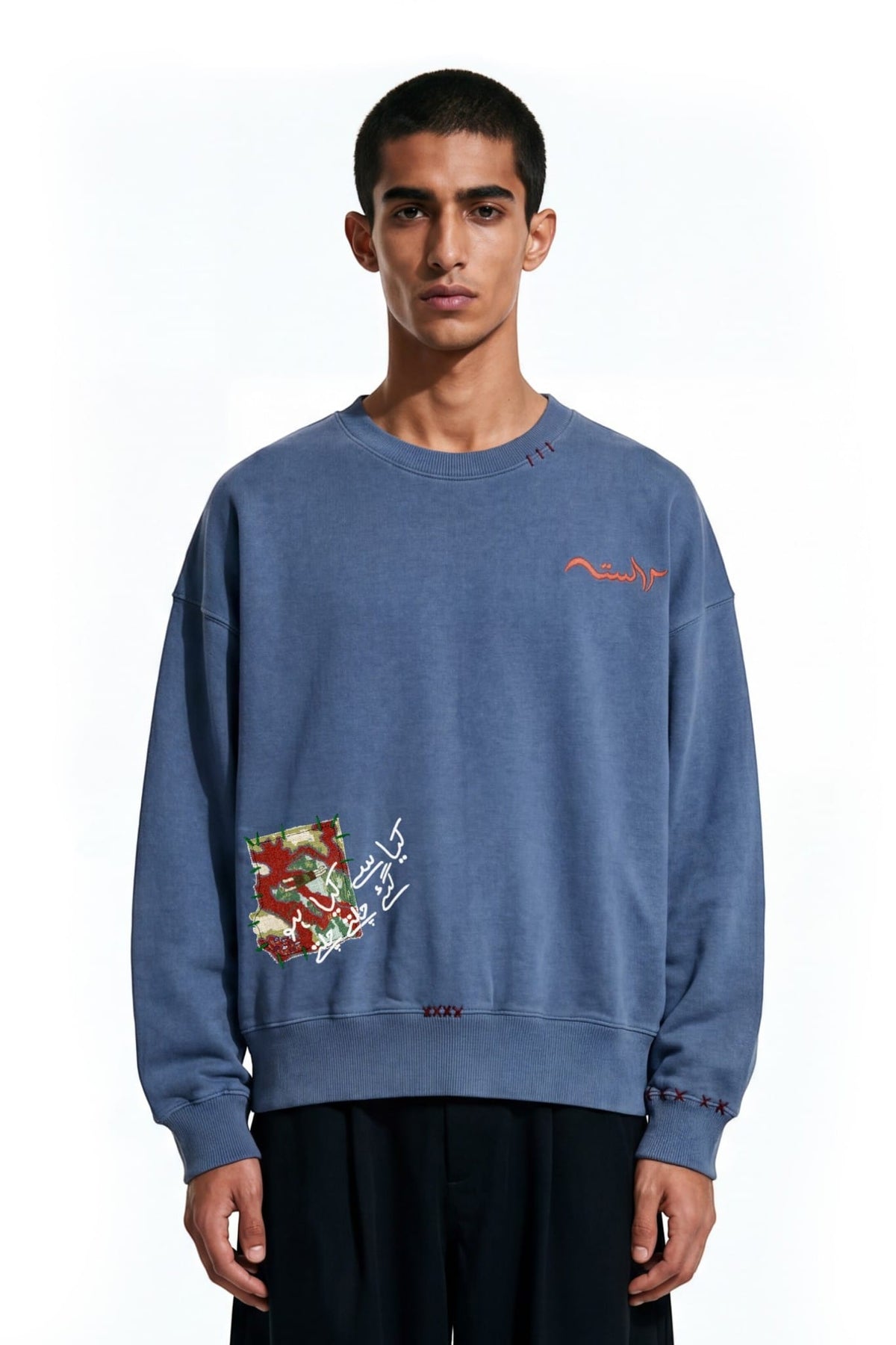 Crafted from 100% cotton fleece with a heavyweight 400 GSM construction. The sweatshirt features khaddar cloud patches and layered textile detailing. A sublimation patch with screen printed text adds visual contrast. Hand fashion stitching enhances the handcrafted character of the garment.