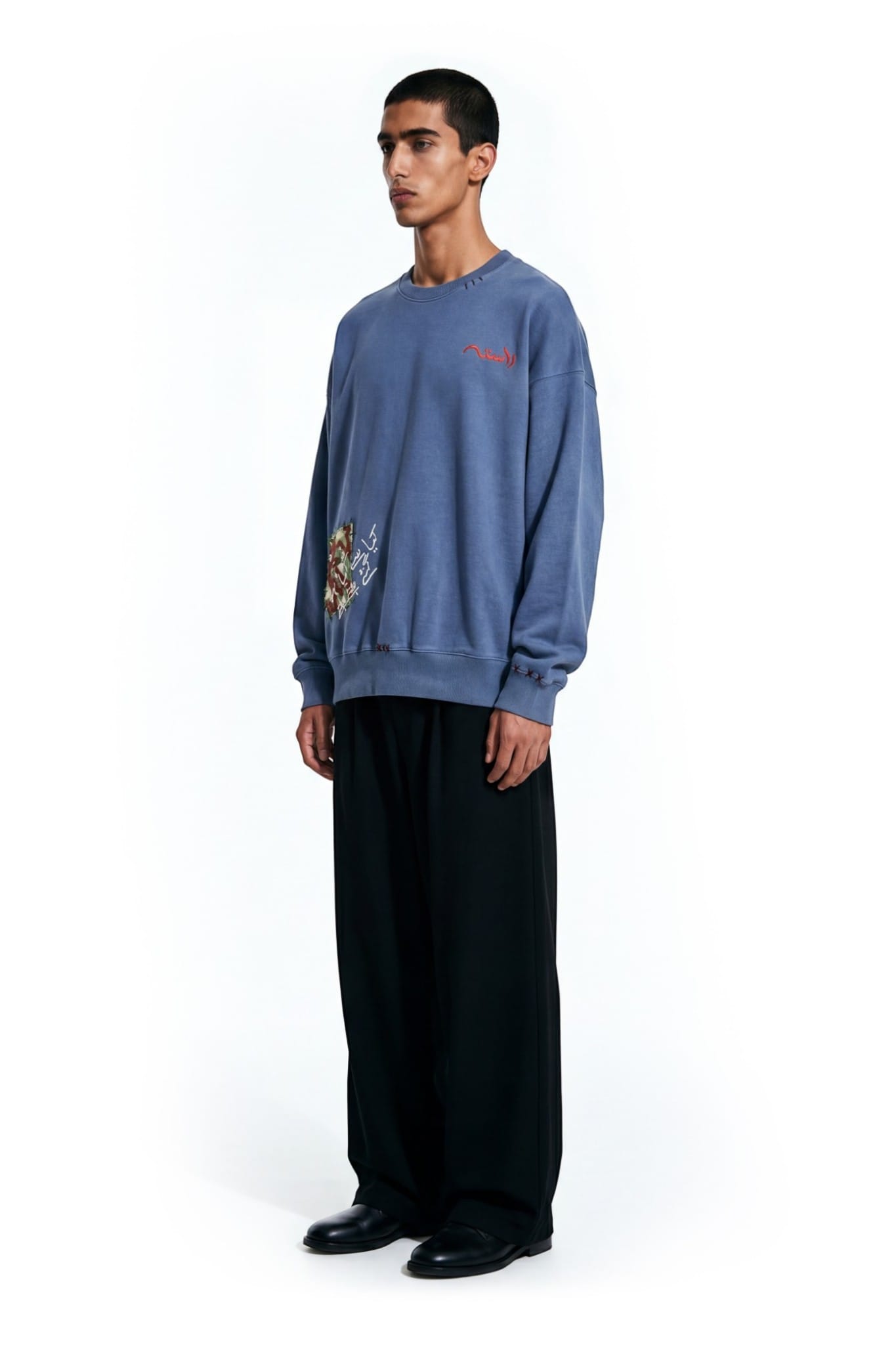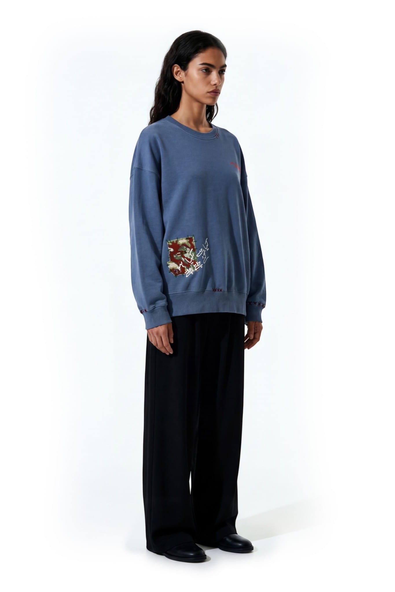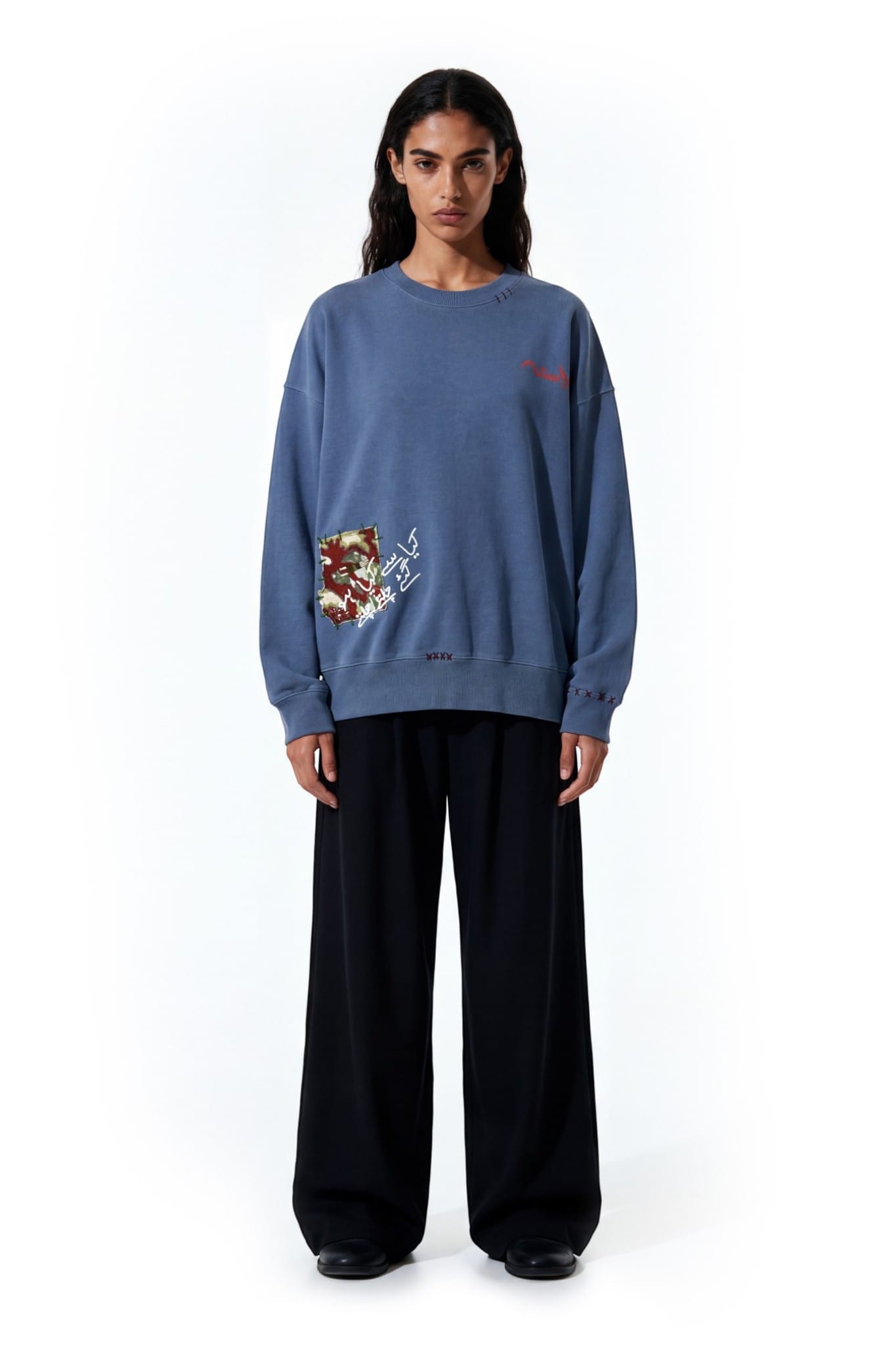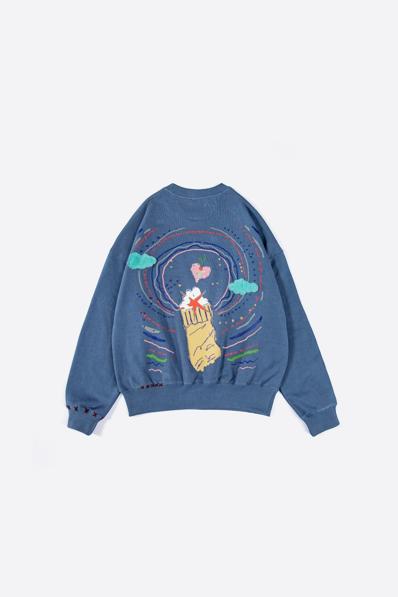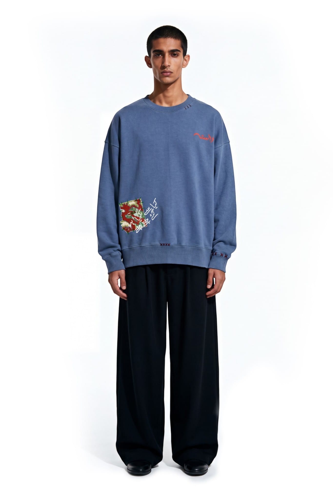 Crafted from 100% cotton fleece with a heavyweight 400 GSM construction. The sweatshirt features khaddar cloud patches and layered textile detailing. A sublimation patch with screen printed text adds visual contrast. Hand fashion stitching enhances the handcrafted character of the garment.