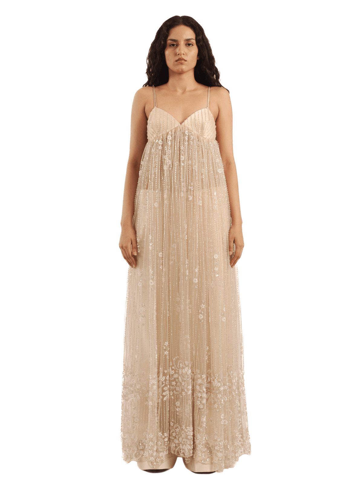 An ethereal vision woven in embellished net, this see-through dress floats like a dream. With delicate spaghetti straps and a soft champagne hue, it drapes the body in sheer elegance, shimmering with floral motifs from top to hem. A romantic silhouette for evenings that blur into memories.