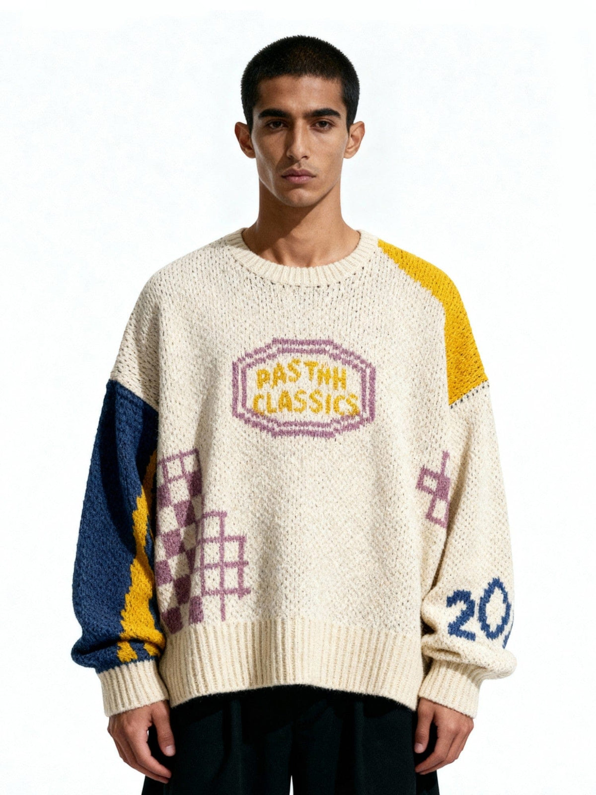 Crafted from a blend of acrylic, nylon, and woolen thread,Sweater blends nostalgic pattern work with modern construction. Featuring tonal checkerboard motifs and subtle color blocking, it reflects Rastah’s balance of heritage and innovation. The relaxed fit and soft hand-feel make it an ideal layering piece for fall and winter, offering comfort and structure in equal measure.