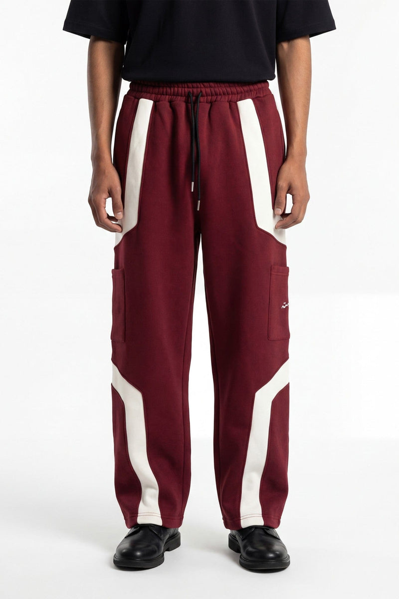 The deep red base is interrupted with off-white racing stripes that curve and break across the legs, giving the piece a dynamic, forward-moving feel. Functional cargo-style pockets add utility, while the elasticated waistband ensures comfort without compromising structure.